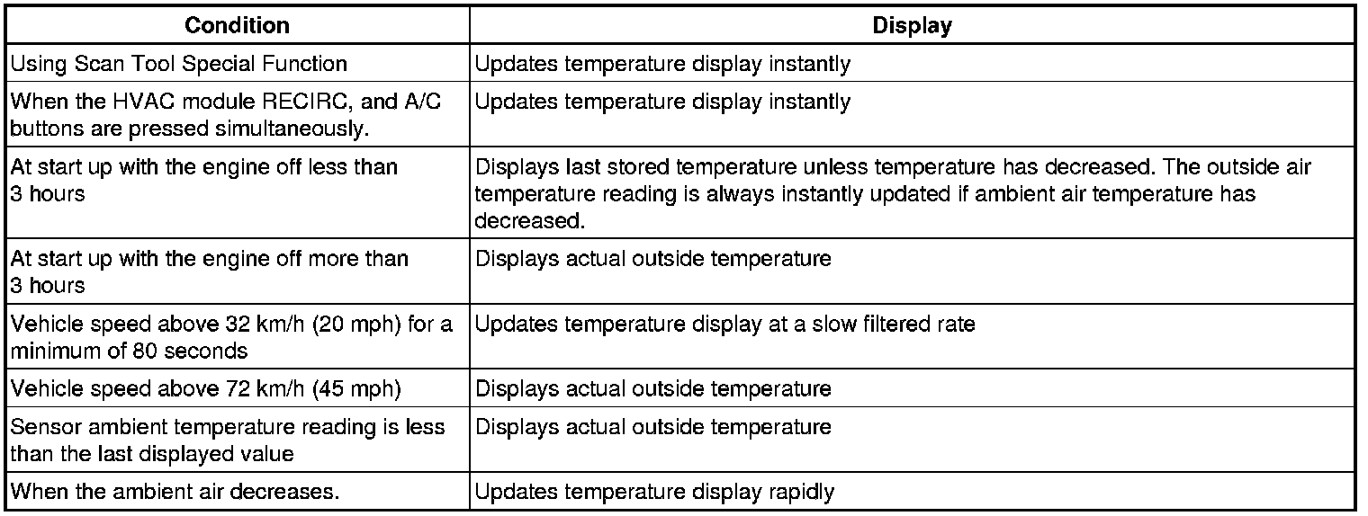 The ambient air temperature sensor mounts underhood and can be affected by city traffic, by idling, and by restarting a hot engine. Therefore, the HVAC control module filters the value of the ambient air temperature sensor for temperature display. If the ambient air temperature sensor drops below 2°C (35°F) the compressor clutch will be disabled until the ignition is OFF for more than 3 hours or an instant OAT update is performed no matter what the actual temperature is due to the filtered value being used by the HVAC control module. The ambient air temperature value is updated under the following conditions: