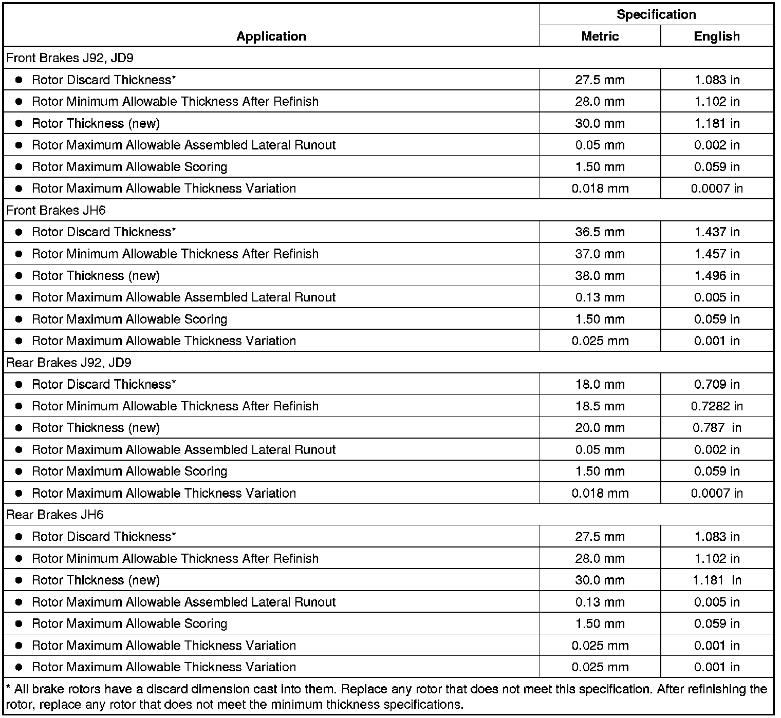 Disc Brake Component Specifications
