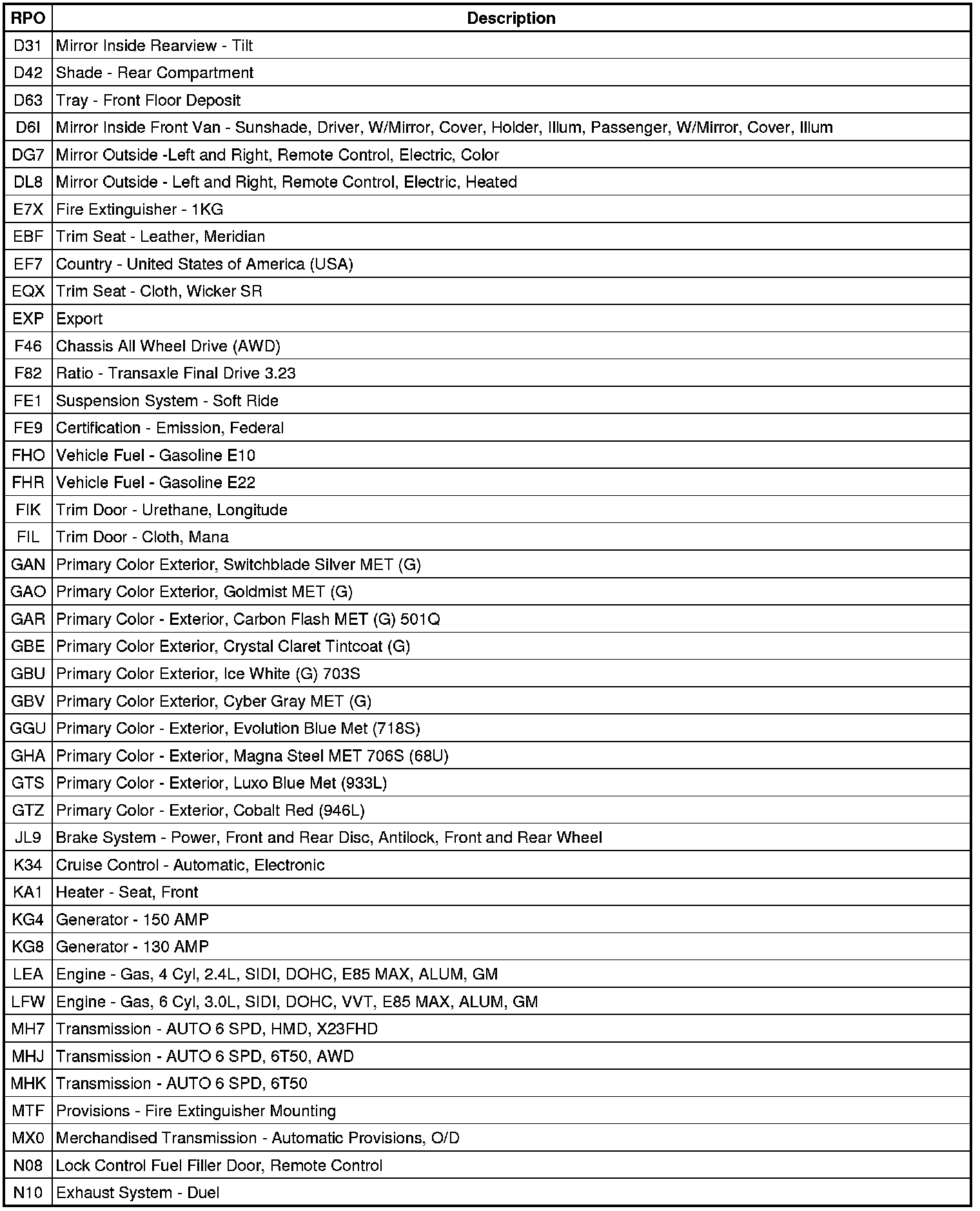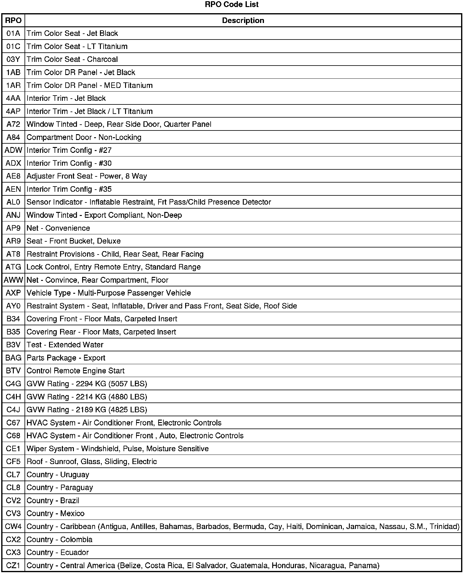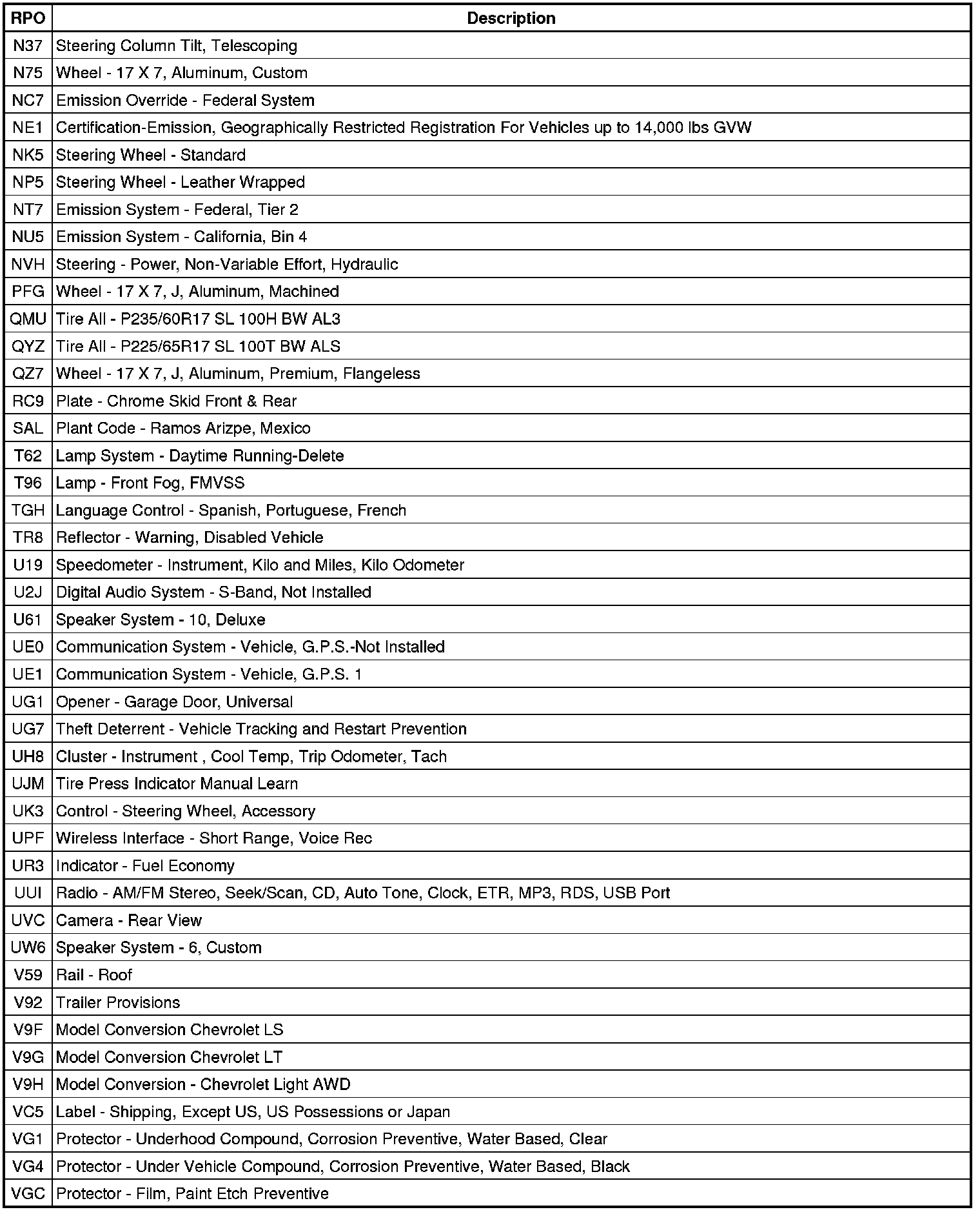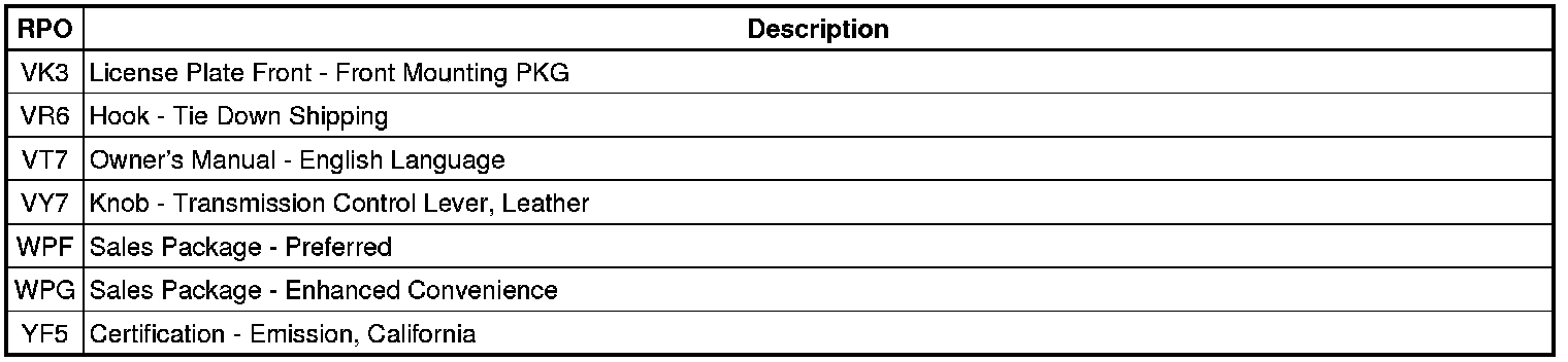 The following table provides the description of the RPO codes that are available on the vehicle. The vehicles RPO list is printed on the Service Parts Identification Label.