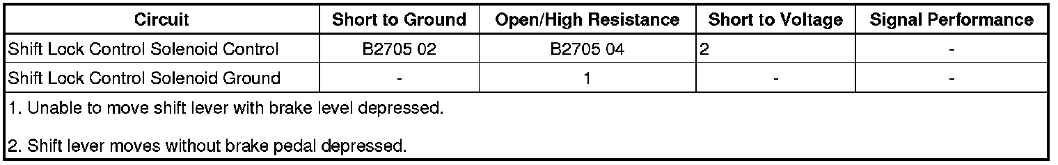 * If the automatic transmission shift lock control circuit is shorted to battery positive voltage, the A/T shift lock solenoid will be inoperative. The vehicle will shift out of PARK without depressing the brake pedal, with Floor Shift. On vehicles with Column Shift the shifter will be locked in PARK.