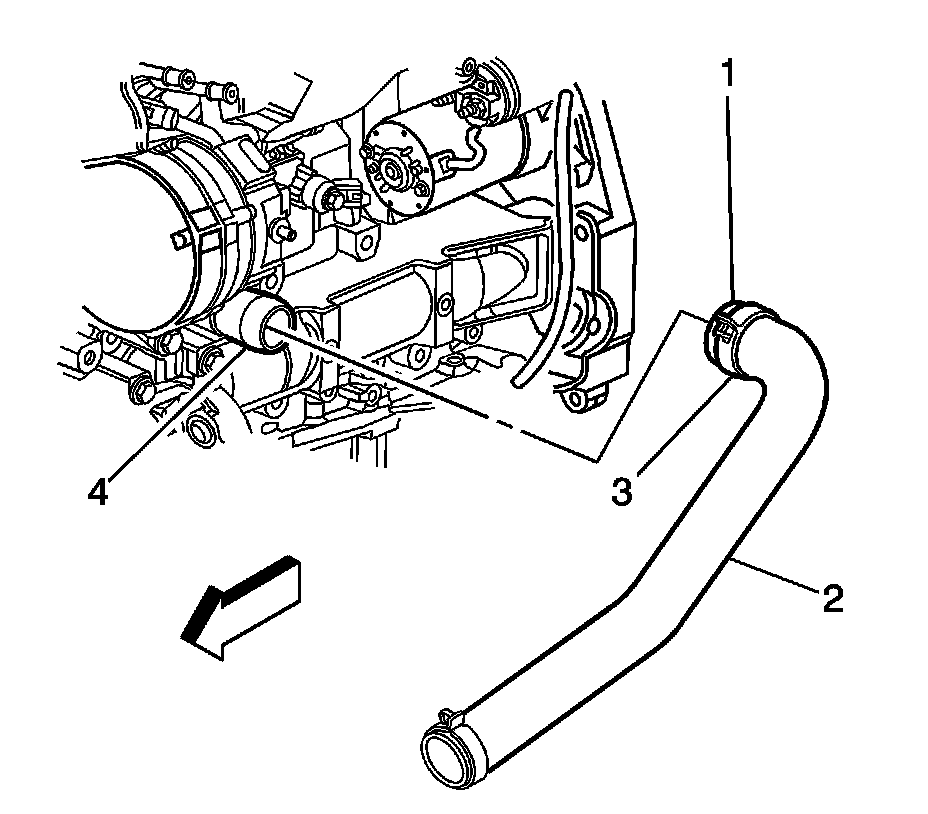 4. Position the J 38185 to the clamp (3) in order to remove the radiator inlet hose (2) from the thermostat housing (4).