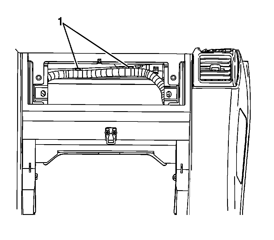 4. Reach through the center stack opening and install the I/P wiring harness clips (1) to the HVAC vent.