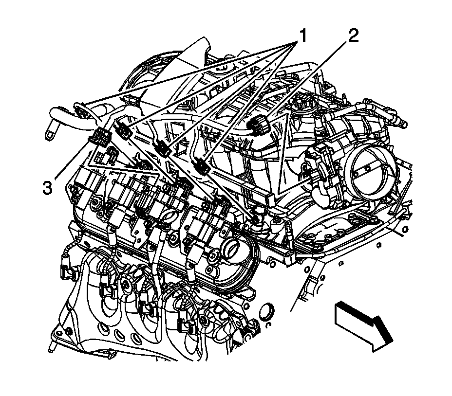 13. Disconnect the engine wiring harness electrical connectors (3) from the fuel injectors.