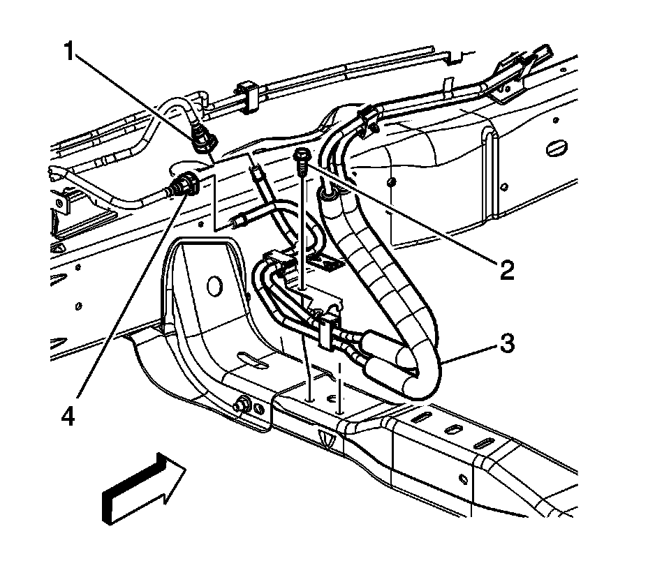 4. Position the chassis fuel feed and EVAP line assembly (3) bracket tab to the crossmember.