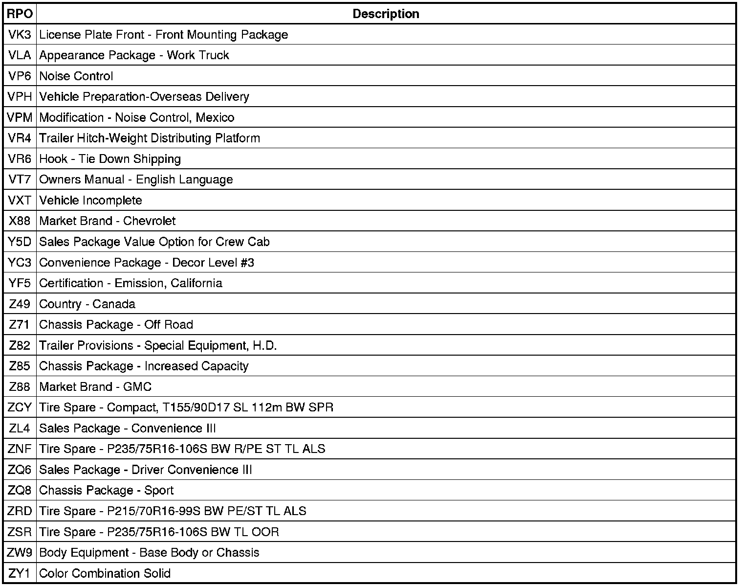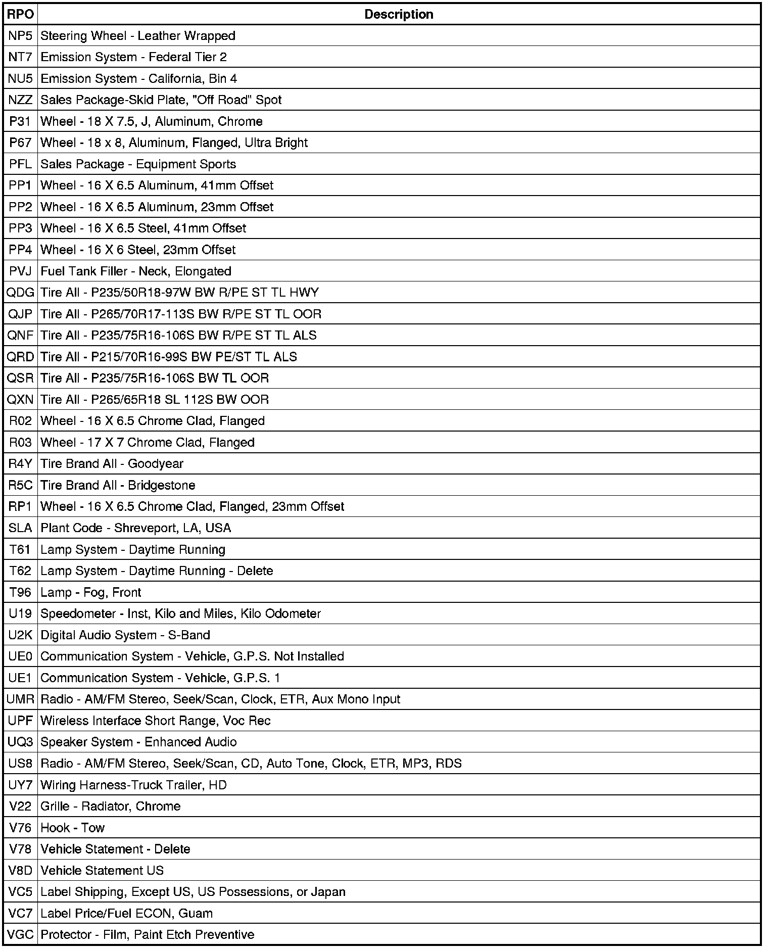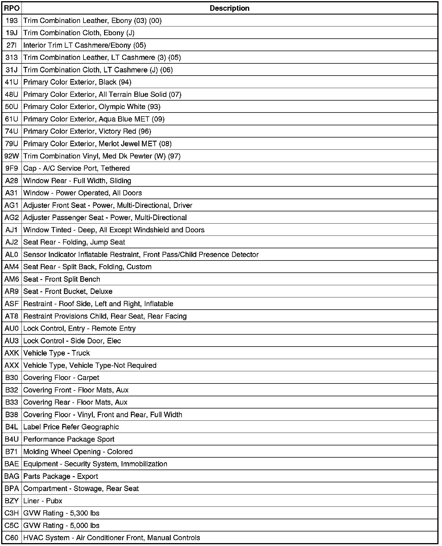 RPO Code List