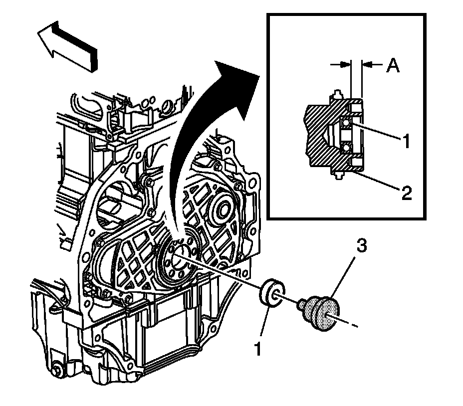The J 45949 (3) will install the pilot bearing (1) to the proper depth of 11.6 mm (0.457 in) (a).