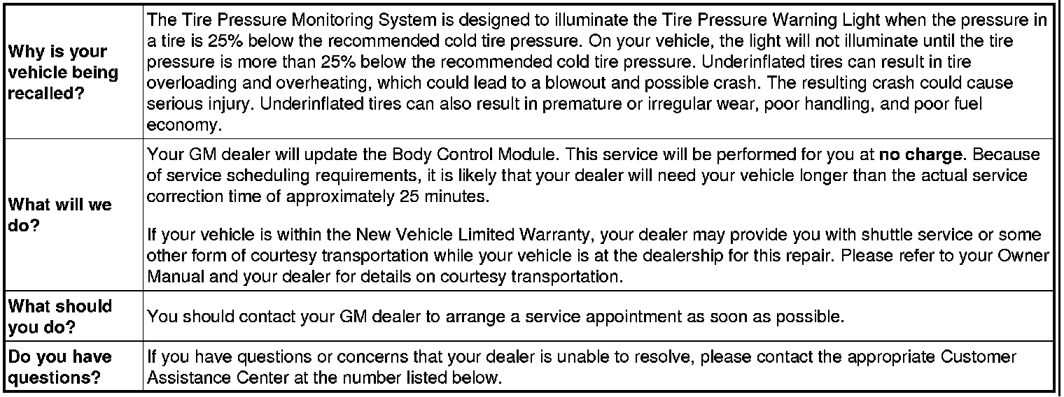 General Motors has decided that certain 2012 model year Chevrolet Equinox and GMC Terrain vehicles fail to conform to Federal Motor Vehicle Safety Standard 138, Tire Pressure Monitoring System. As a result, GM is conducting a recall. We apologize for this inconvenience. However, we are concerned about your safety and continued satisfaction with our products.