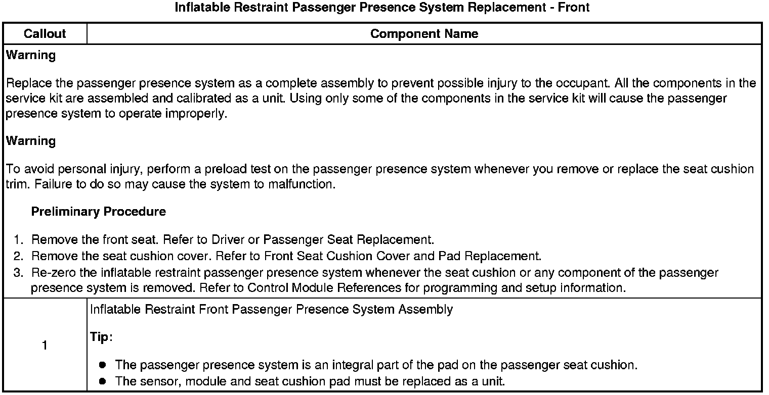 Inflatable Restraint Passenger Presence System Replacement - Front