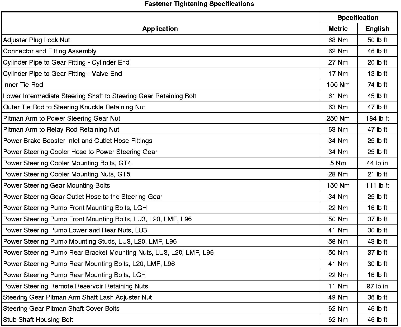 Fastener Tightening Specifications
