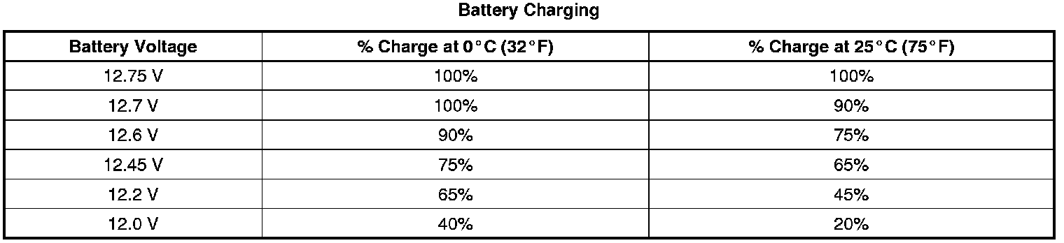 4. Measure the battery voltage at the battery terminals. Refer to the following table to determine the state of charge according to the estimated battery temperature: