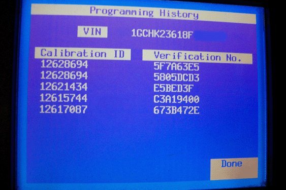 9. Take a clear digital picture of the Tech 2(R) Programming History screen showing the complete VIN, Calibration IDs and the CVNs. Retain the printout information and the Tech 2(R) screen photograph with the repair order.
