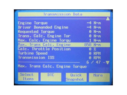 A transmission control module (TCM) algorithm has been implemented that records a maximum calculated input torque. This information is available via the Tech 2(R).
