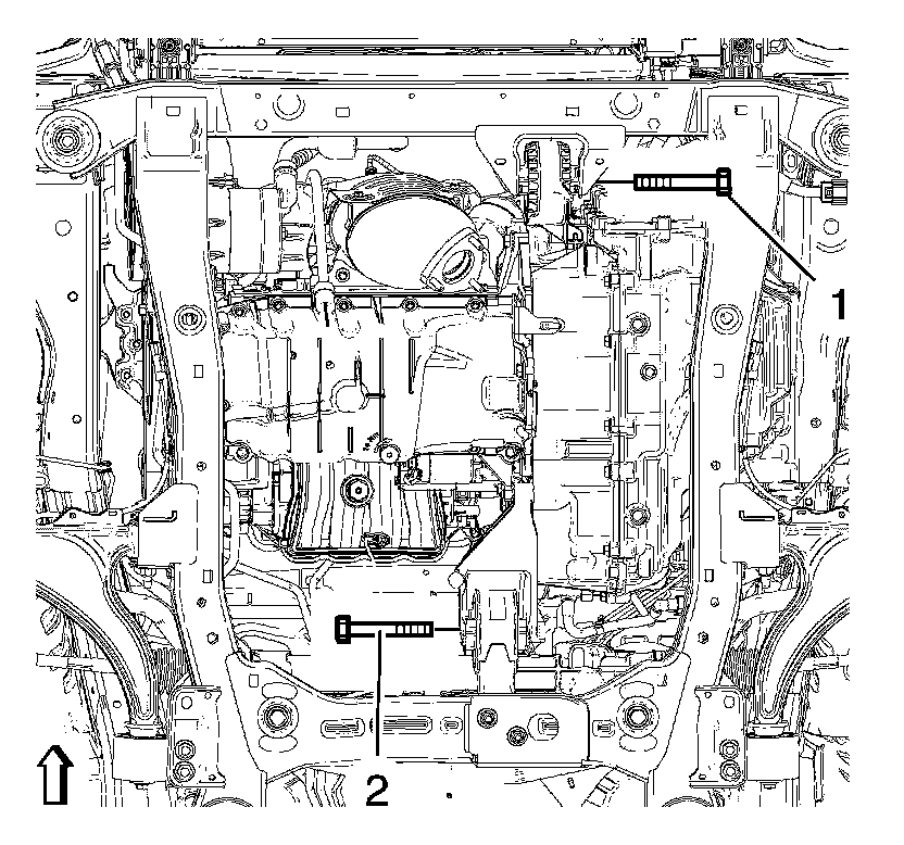 15.Remove the front (1) and the rear (2) transmission mount bracket bolts.
