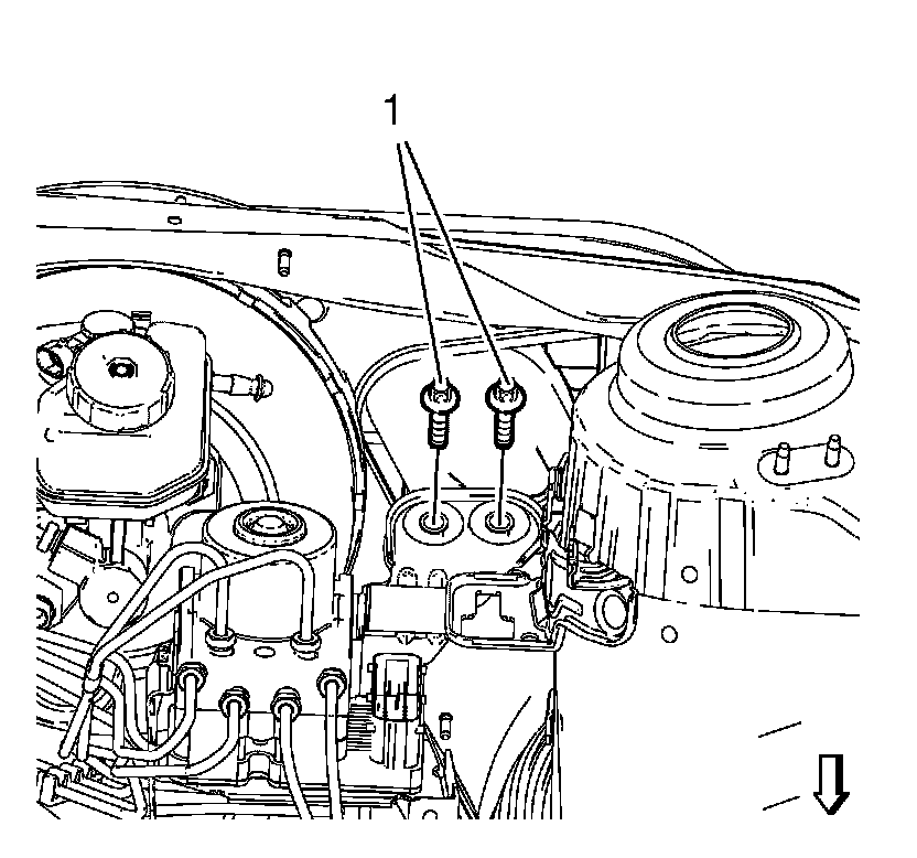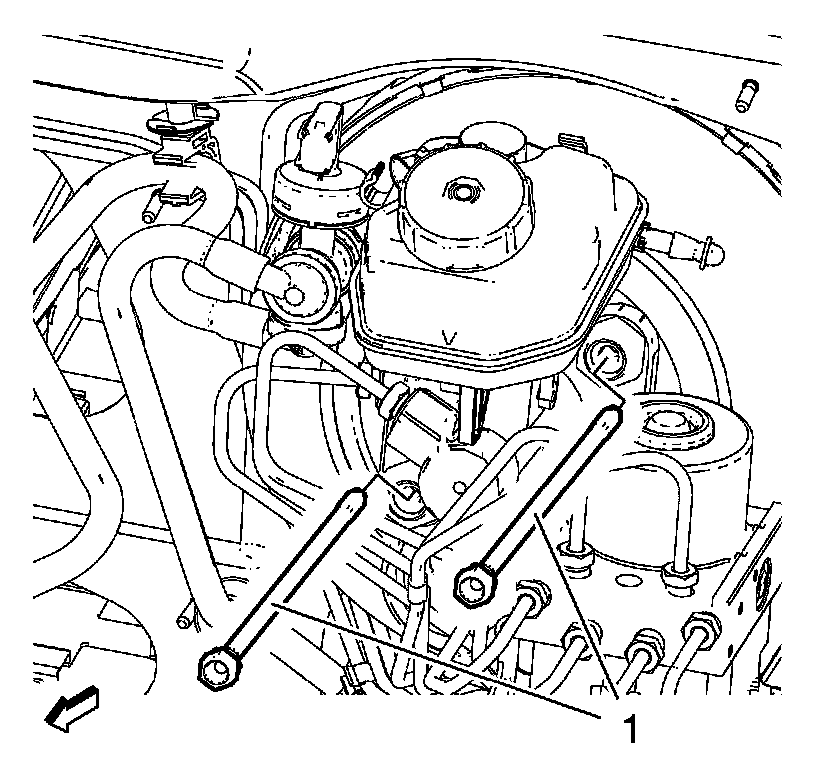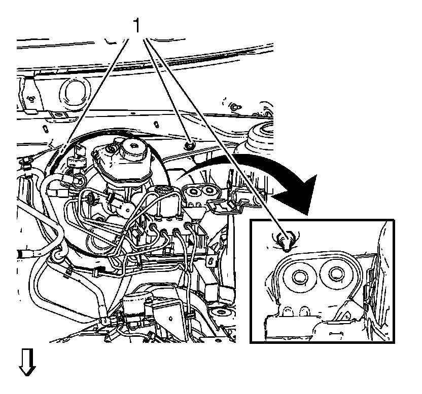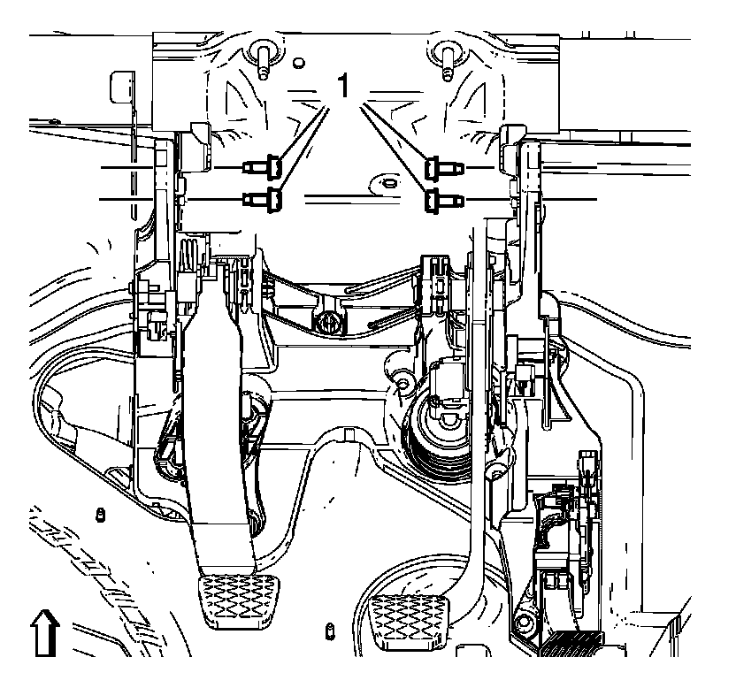 8. Pull the brake booster and the BPMV assembly forward in order to get access to the brake pedal bracket nuts (1).