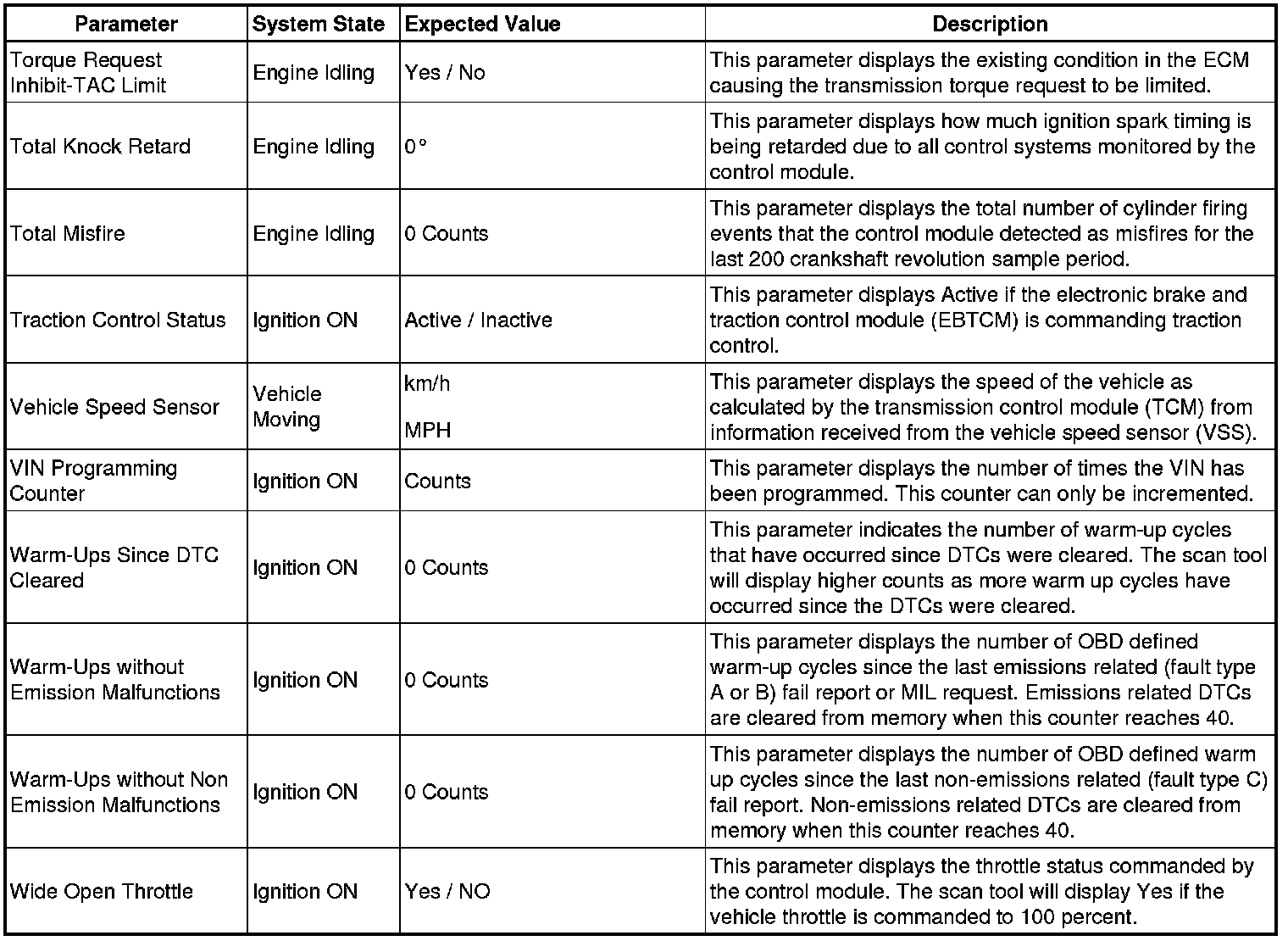 Only the parameters listed below are referenced in this service manual for use in diagnosis.