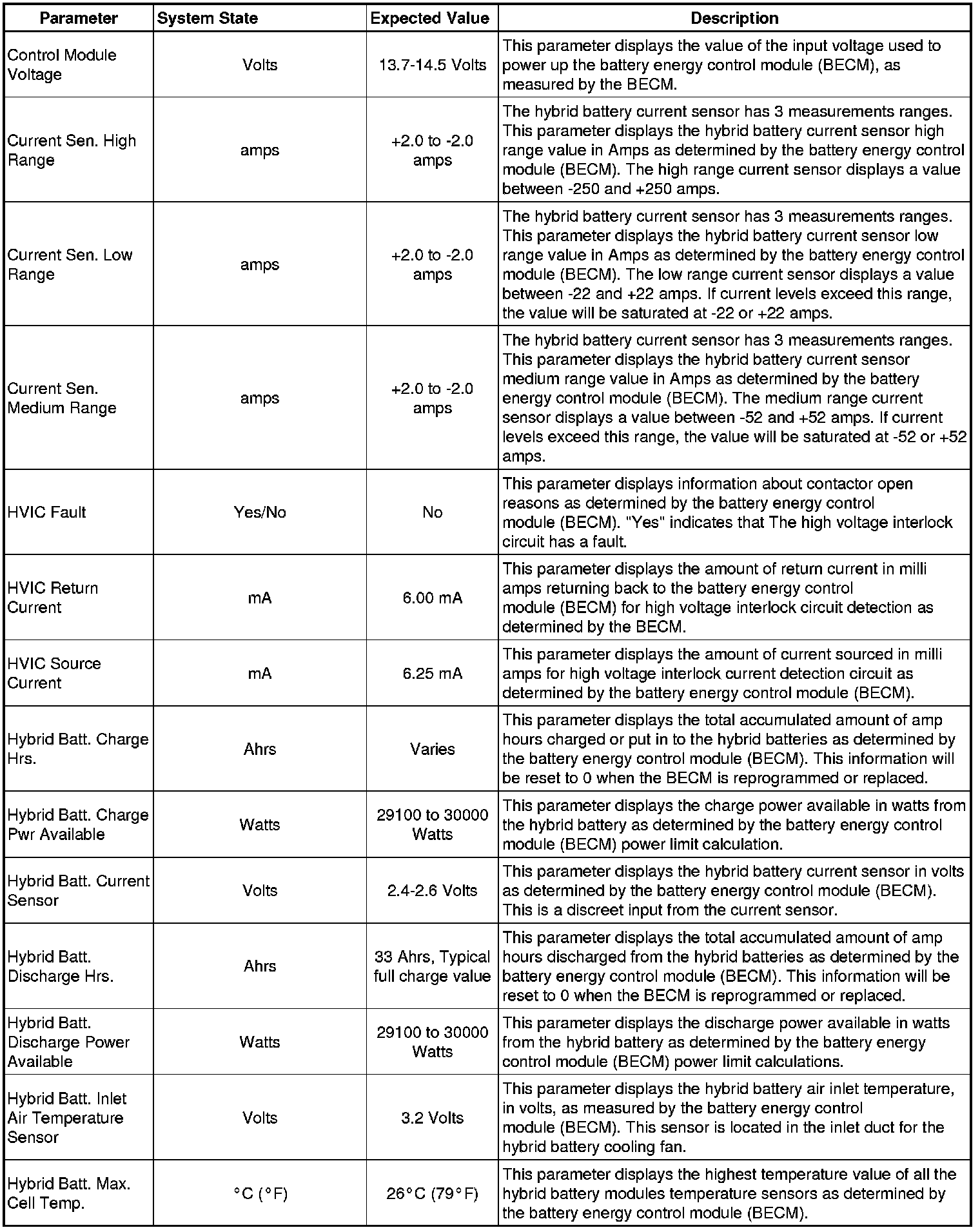 If all values are within the expected range described below, refer to Symptoms - Hybrid Energy Storage Symptom Related Diagnostic Procedures for diagnosis.