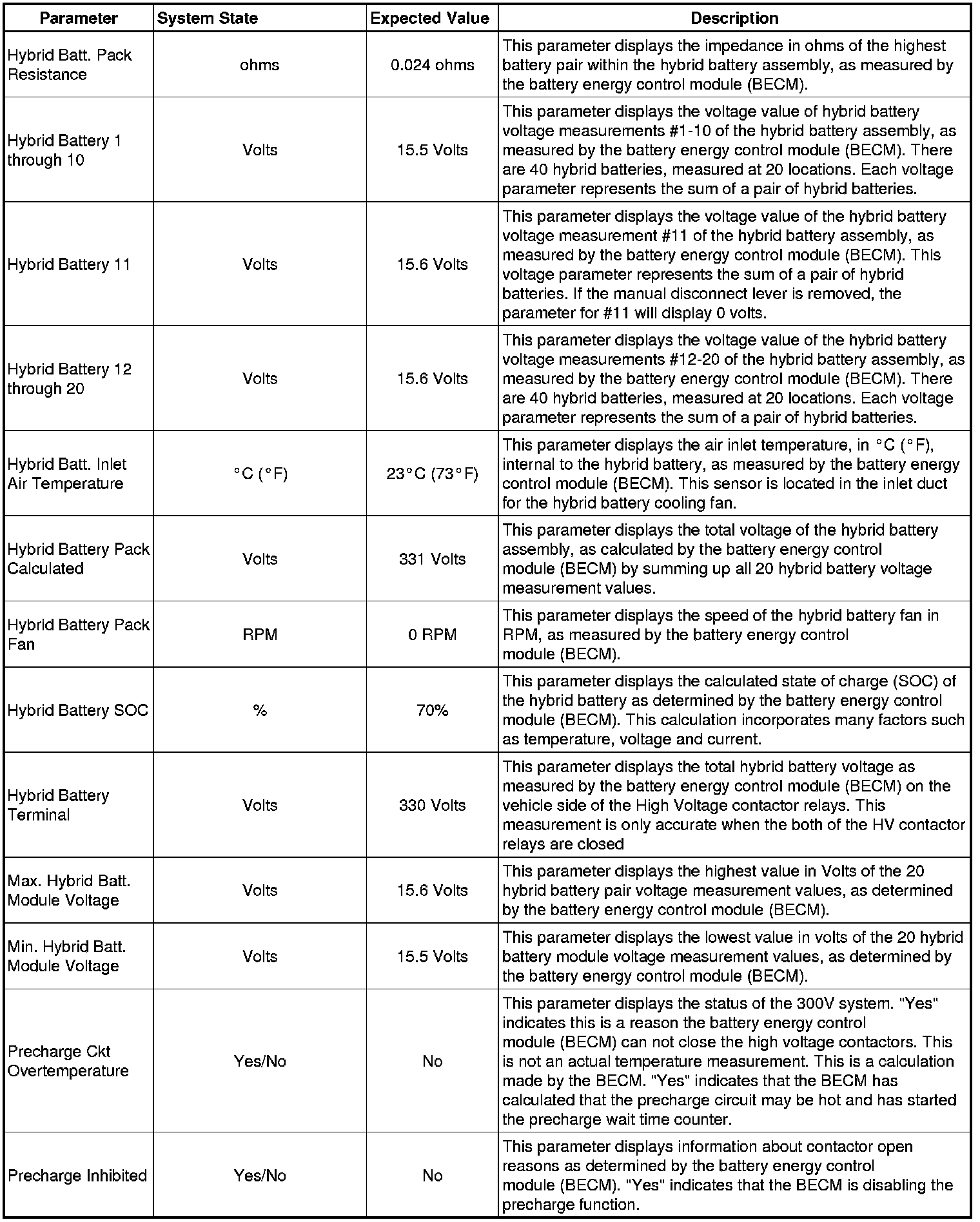 The Drive Motor Generator Battery Control Module Scan Tool Data List contains all Hybrid Battery related parameters that are available on the scan tool. The list is arranged in alphabetical order. A given parameter may appear in any one of the data lists, and in some cases may appear more than once, or in more than one data list in order to group certain related parameters together.