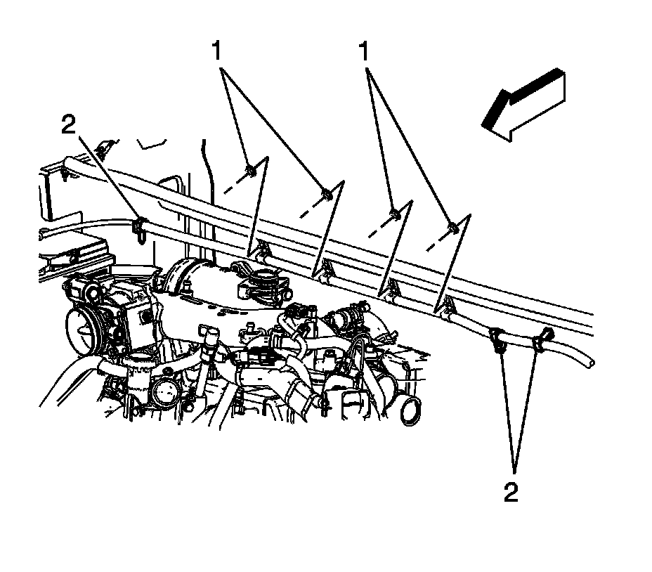 6. Ensure that the underhood fuse block retainers (2) are in the open position.