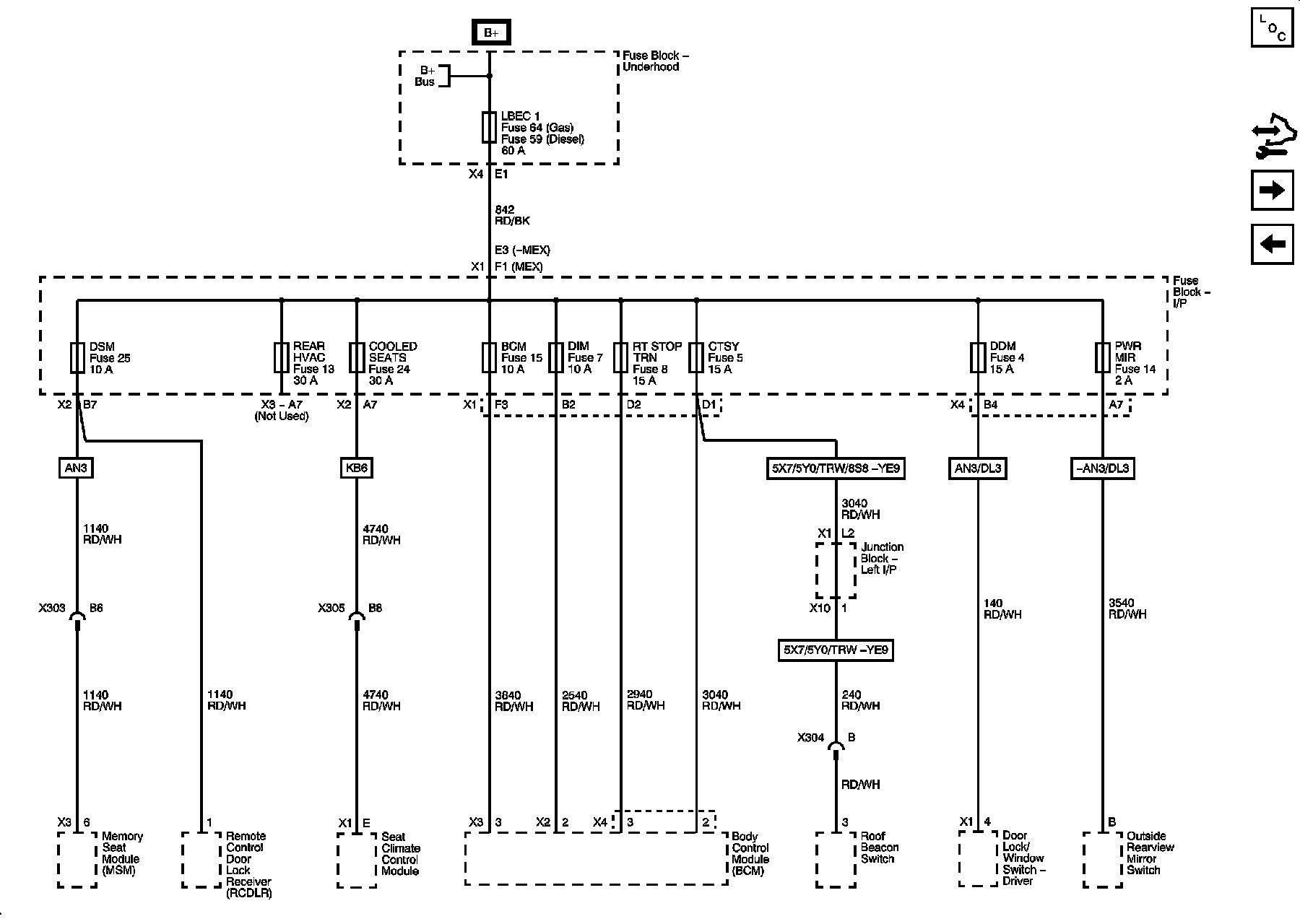 BCM, COOLED SEATS, CTSY, DDM, DIM, DSM, LBEC 1, PWR MIR, REAR HVAC, and RT STOP TRN Fuses