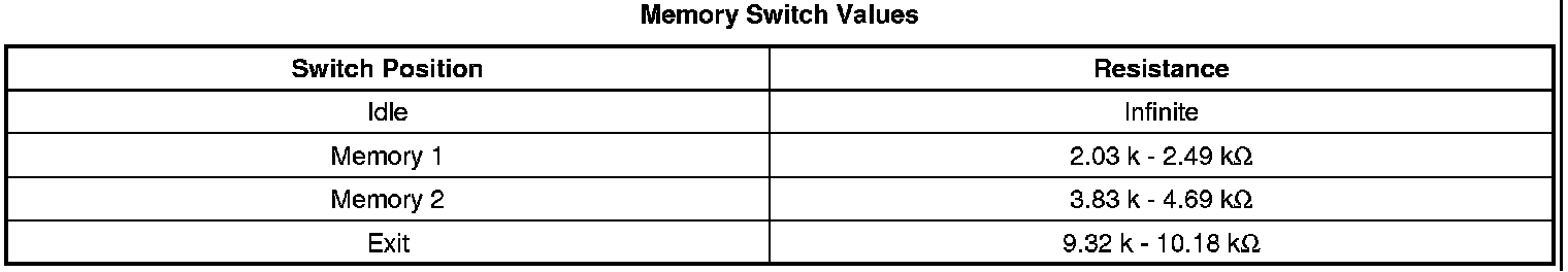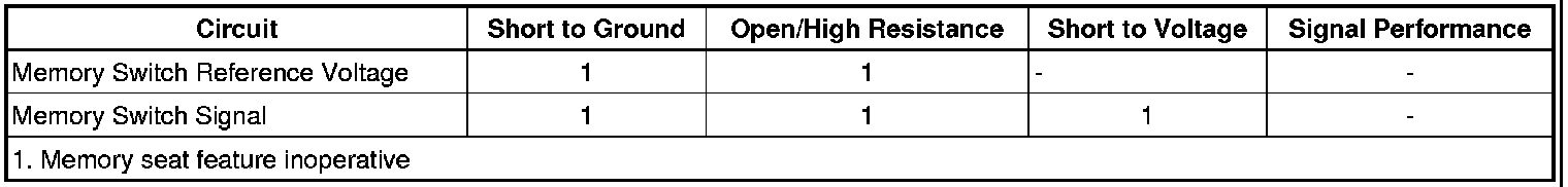 Reference voltage is supplied to the memory switch from the driver door lock/window switch. When a memory switch is pressed, reference voltage is applied through the switch contacts, a series of resistors and thorough the memory switch signal circuit to the door lock/window switch. The door lock/window switch then sends a serial data message to the memory seat module (MSM) indicating the memory recall request. The MSM then commands the appropriate seat motors to move to the pre-recorded seat positions stored in memory in response to the switch input.