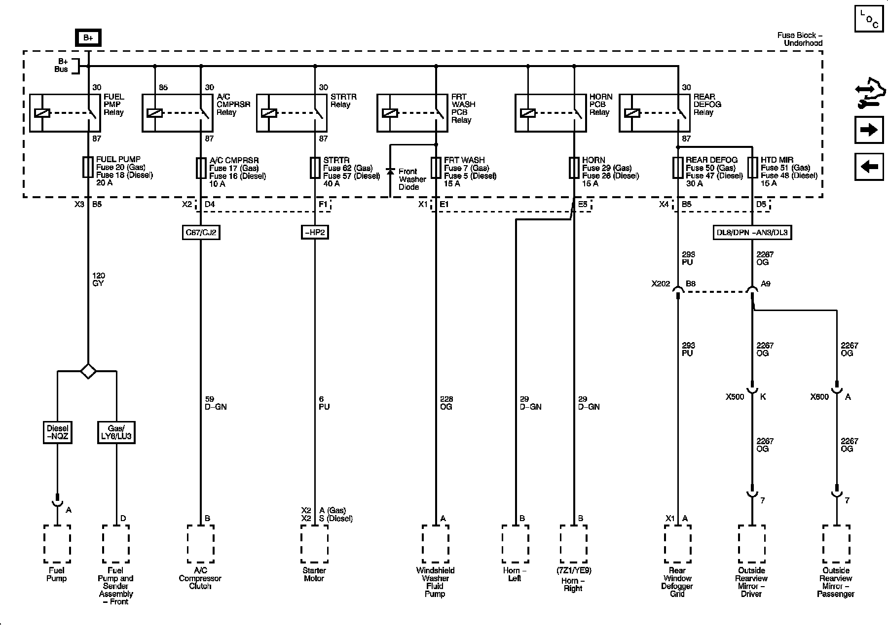 A/C CMPRSR, FRT WASH, FUEL PUMP, HORN, HTD MIR, REAR DEFOG, and STRTR Fuses