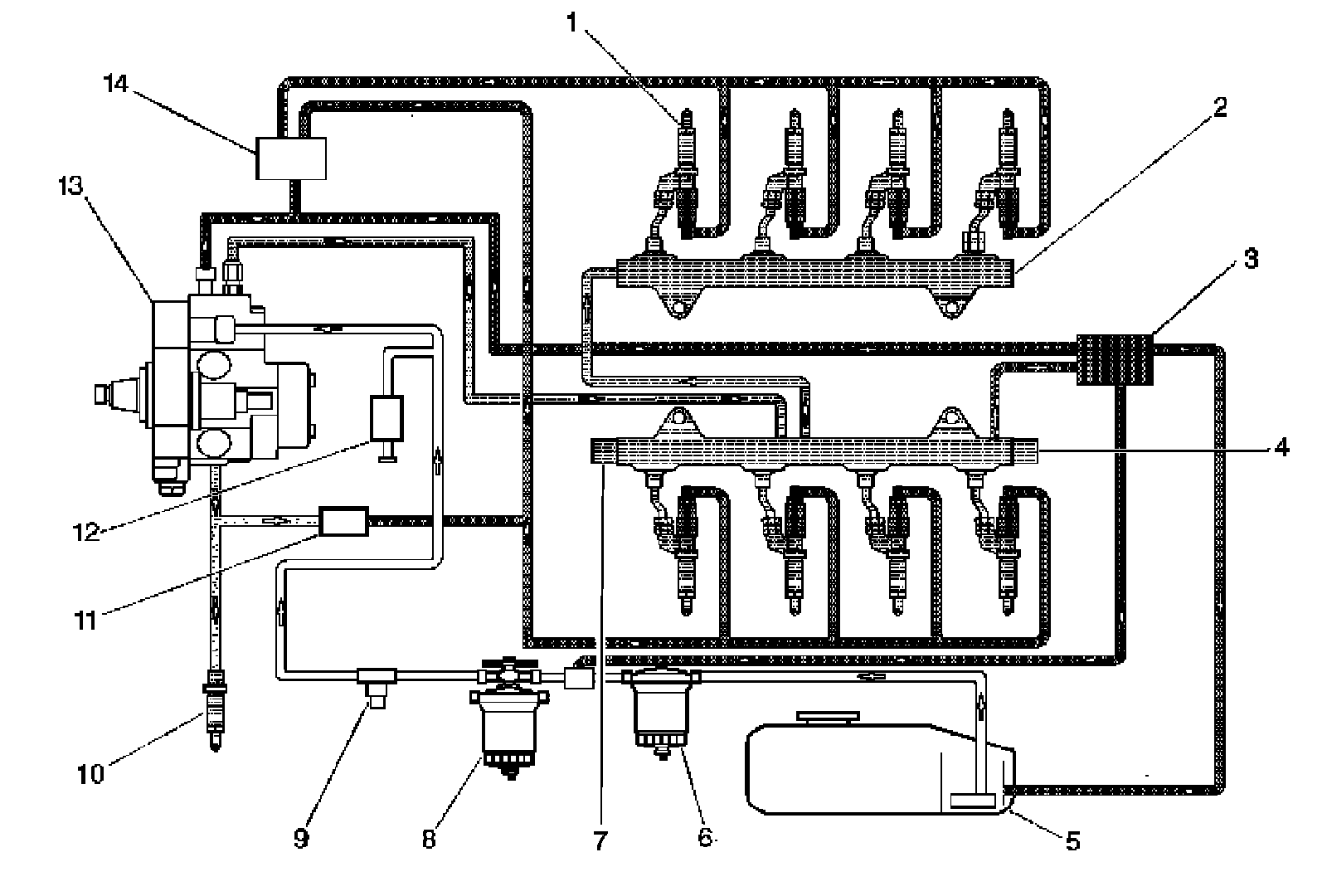 The fuel tank (5) stores the fuel supply. A mechanical fuel injection pump (13), located below the engine intake, includes the fuel supply pump and the high-pressure pump. Fuel is drawn through the diesel fuel conditioning module (8), which combines a water separator, hand operated fuel prime pump, filter element and then through a fuel filter vacuum switch (9) to the fuel injection pump. The engine control module (ECM) controls the fuel pump pressures by using two fuel pressure regulators, fuel pressure regulator 1 is located on top of the fuel injection pump and fuel pressure regulator 2 (7) is located on a fuel rail (2). The fuel pressure sensor (4) provides a voltage signal to the ECM to indicated fuel rail pressures. The high pressure fuel is supplied to the fuel injectors (1) through separate high pressure pipes. The fuel injectors supply fuel directly to the combustion chambers of the engine. The fuel that is not injected into the combustion chamber is used to help lubricate and cool the injector and is routed back to the fuel tank. The fuel injector return line pressure regulator (14) maintains fuel pressure on the return side of the fuel injectors. This is required for proper fuel injector operation. In the event the vehicle runs out of fuel a check valve (11) in the exhaust aftertreatment fuel injector (10) supply line opens and the fuel supply pump back fills the return side with fuel.
