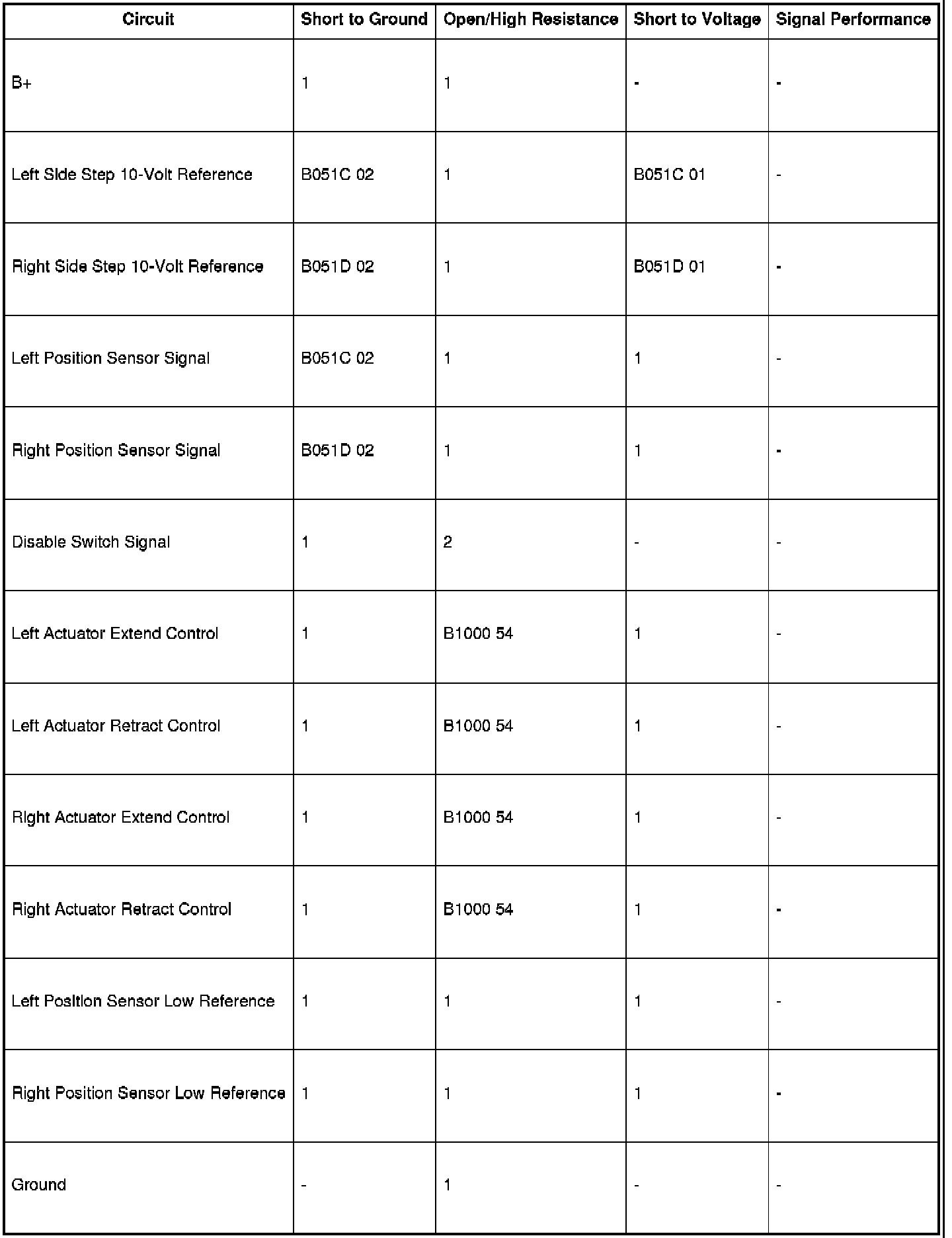 The assist step control module (ASC) controls the assist step actuators to extend or retract the assist steps. Each actuator consists of an electric motor and a potentiometer. The module supplies a low reference and 10-volt reference source voltage to the potentiometer. The ASC module monitors the voltage drop across the potentiometer on the position signal circuit. When the actuator shaft rotates, the voltage on the position signal circuit changes. The ASC module supplies the actuator motor with a 12-volt control circuit and a ground control circuit. The ASC module controls the direction of the actuator by changing the polarity of the control circuits.