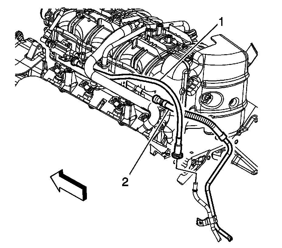 13. Connect the chassis fuel feed pipe (2) quick connect fitting to the fuel rail. Refer to Metal Collar Quick Connect Fitting Service Service and Repair.