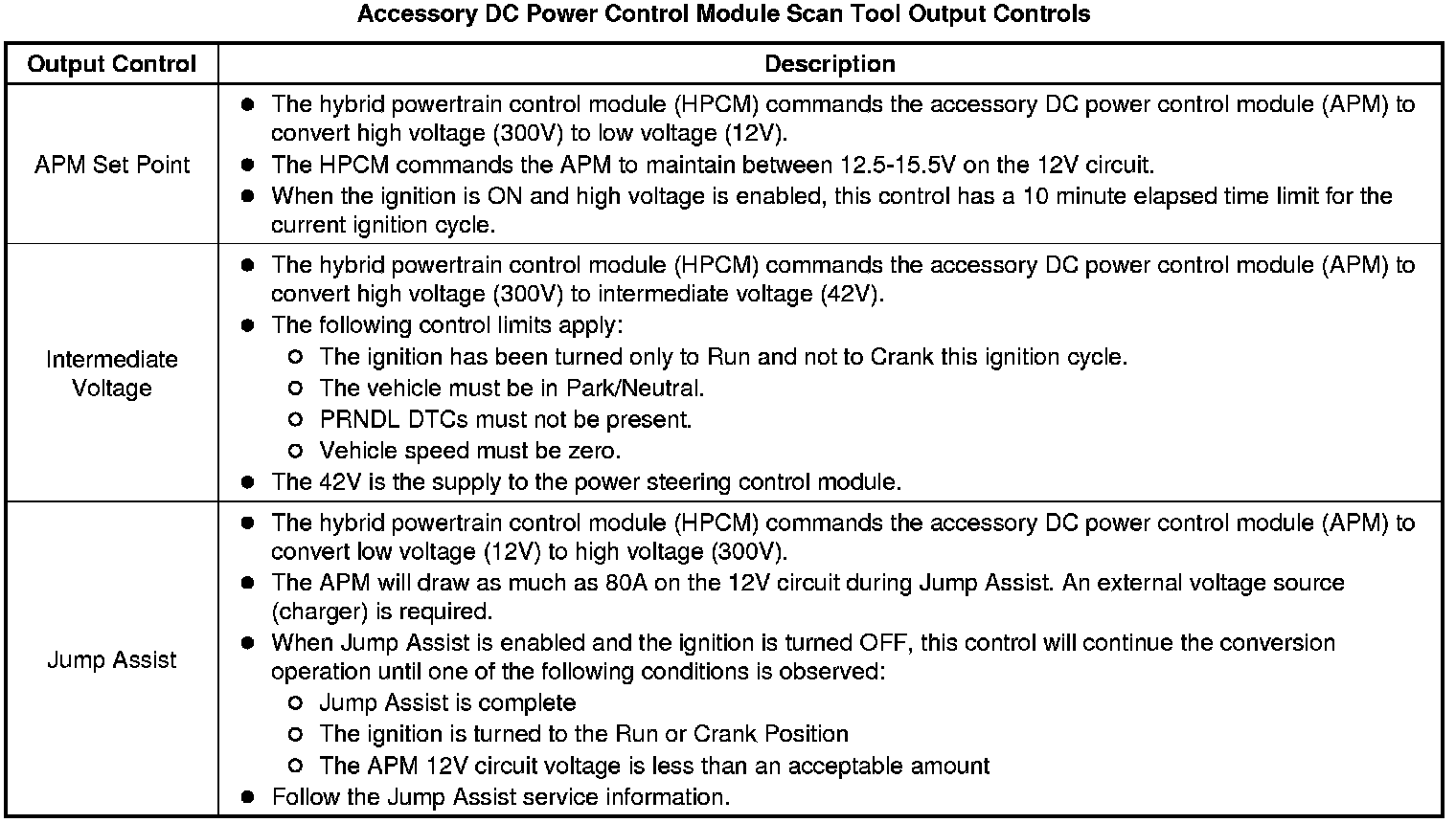 The Accessory DC Power Control Module Scan Tool Data Parameters list contains hybrid controls-related parameters. The list is arranged in alphabetical order.