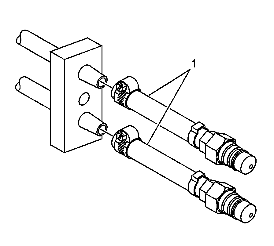1. Connect the DT 45096-30 - cooler flush adapter (1) to the vehicle transmission oil cooler supply and return lines at the transmission.
