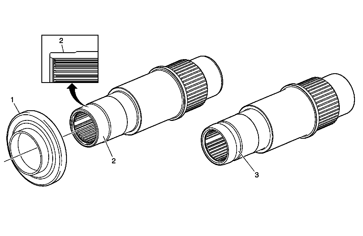 The new design deflector (1) can be installed onto all current and prior model year Magna RPOs NQF, NQG, NQH and NPO applications providing the new design front output shaft (2) is also installed. Second design front output shafts can be identified by the machined area on the OD output end of the shaft (2). First design front output shafts can be identified by the dust boot clamp groove (3) located at the OD output end of the shaft. The new design slinger will NOT install onto the first design shafts.
