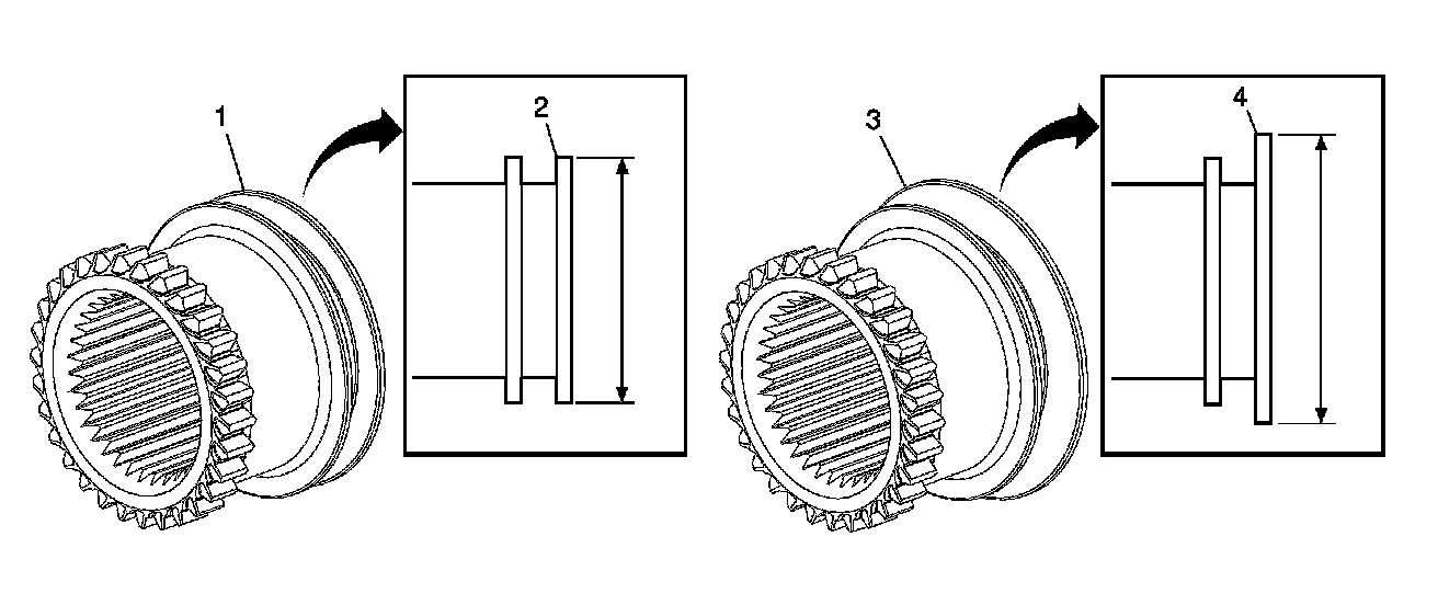 Interim 2012 model year the High/Low shift fork, fork pad and High/Low clutch design changed. The first design high/low clutch (1) can be identified by having a 73 mm (2.87 in) OD rear flange (2). The second design high/low clutch (3) can be identified by having a 76 mm (2.99 in) OD rear flange (4).