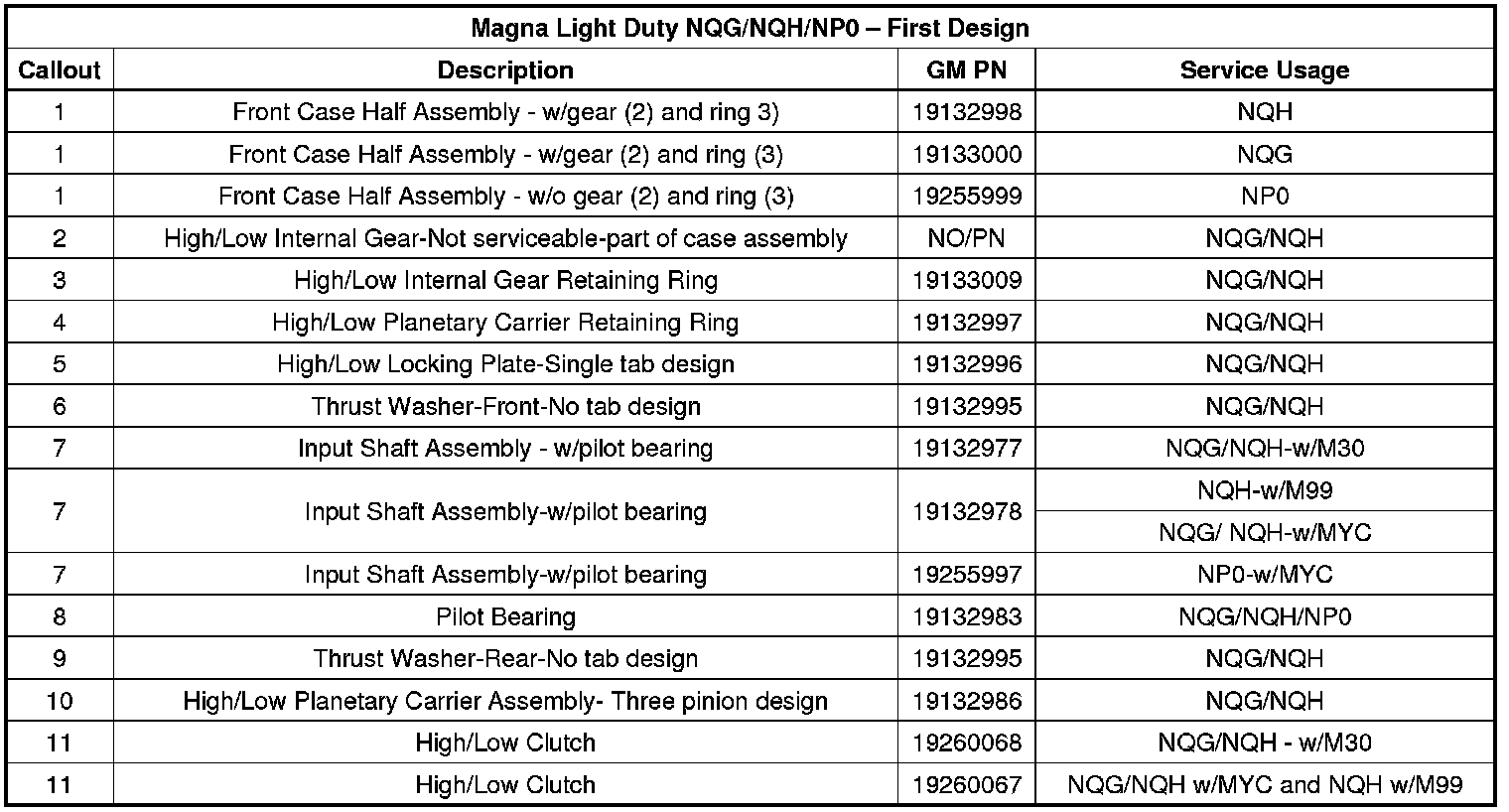 - 2007-12i Magna LD NQG/NQH - produced with first-design content. First design service components are available. A second-design assembly may be used for back-service in a first-design application.