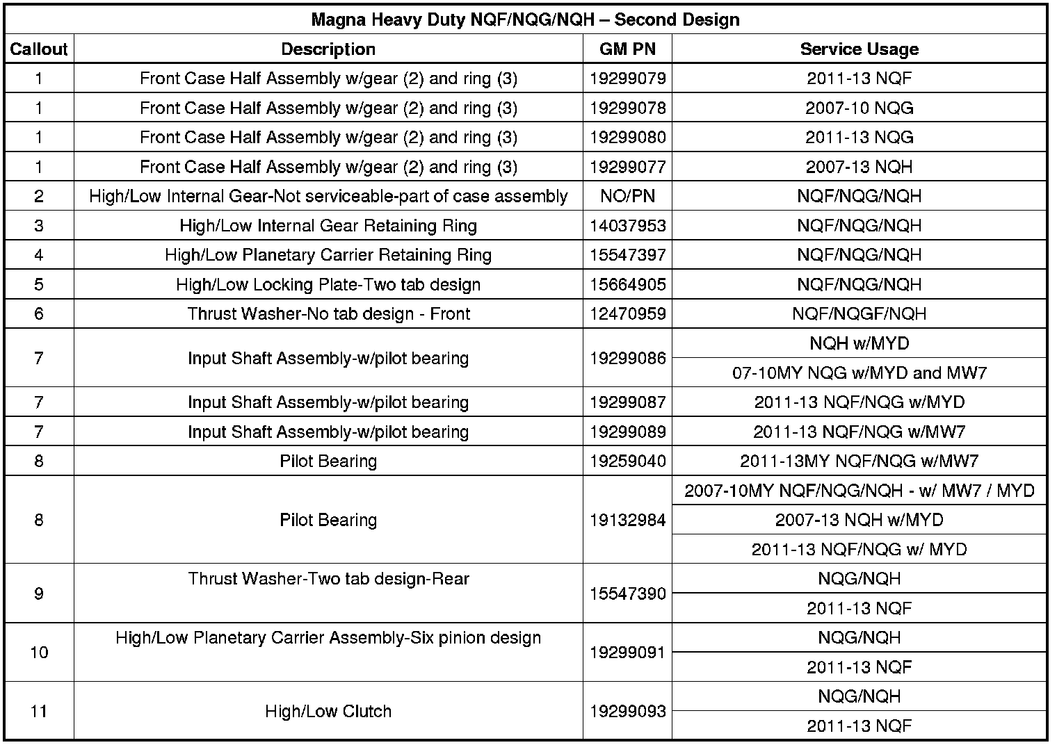 2007-2010 MY Heavy Duty NQF transfer case assemblies were only produced with first-design content. Service 2007-2010 MY Heavy Duty NQG transfer case service assemblies may contain either first or second design content.
