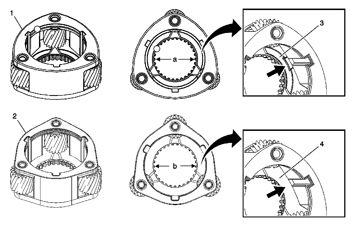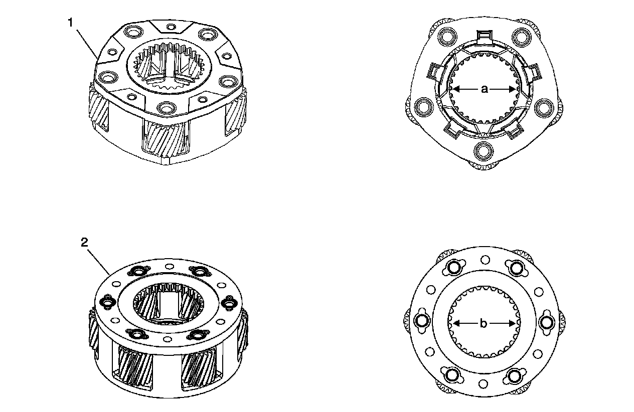 The second-design light-duty 3-pinion high/low planetary carrier (2) can be identified as having a 29 tooth design with an inside diameter (b) of 60.2 mm (2.37 in). In addition, the second-design carrier can also be identified by the lack of a recessed washer pocket (4) at the rear thrust washer location.