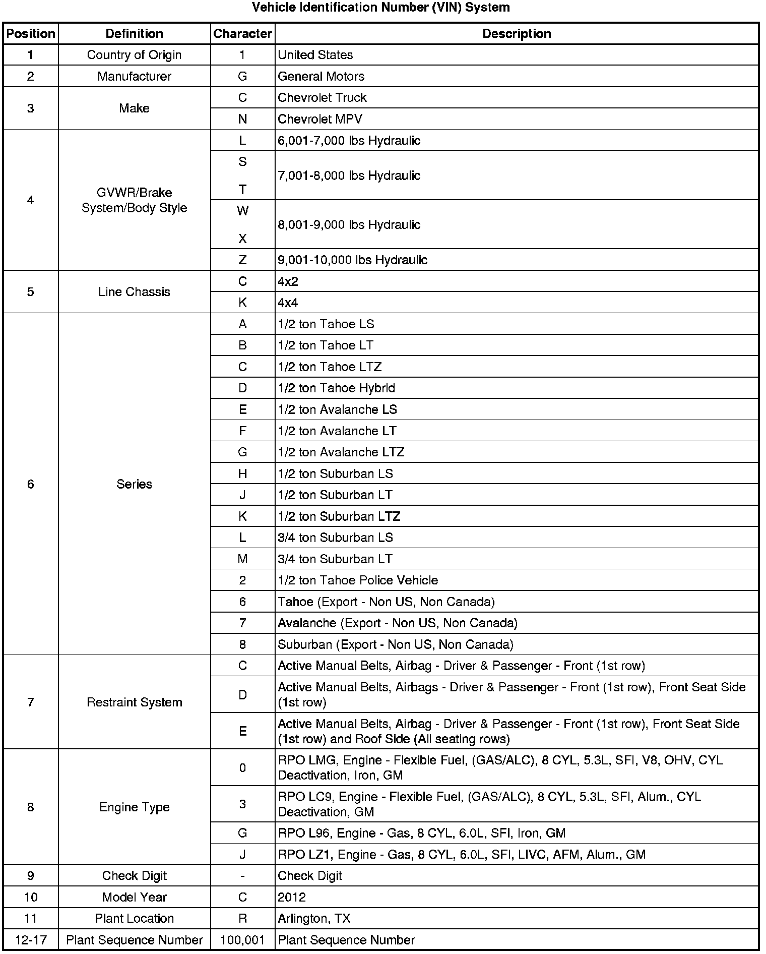 Vehicle, Engine and Transmission ID and VIN Location, Derivative and Usage (Chevrolet)