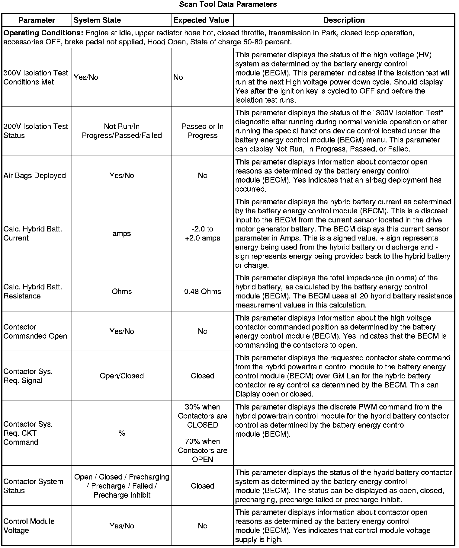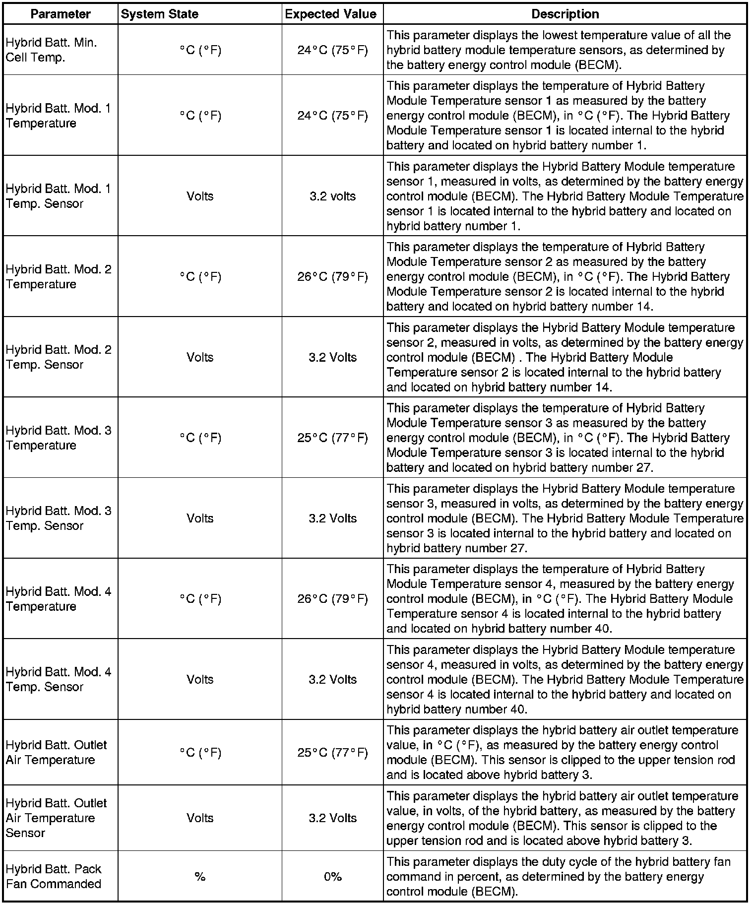 The Drive Motor Generator Battery Control Module Scan Tool Data List contains all Hybrid Battery related parameters that are available on the scan tool. The list is arranged in alphabetical order. A given parameter may appear in any one of the data lists, and in some cases may appear more than once, or in more than one data list in order to group certain related parameters together.
