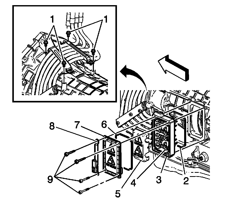 8. Remove and lower the transmission enough to gain access to the 3 phase cable bracket bolts (1). Refer to Transmission Replacement Transmission Replacement.