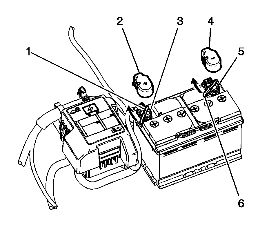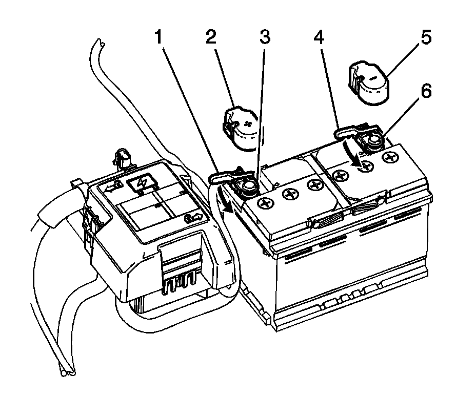 3. Reposition the positive battery cable insulating cover (2) from over the positive terminal.