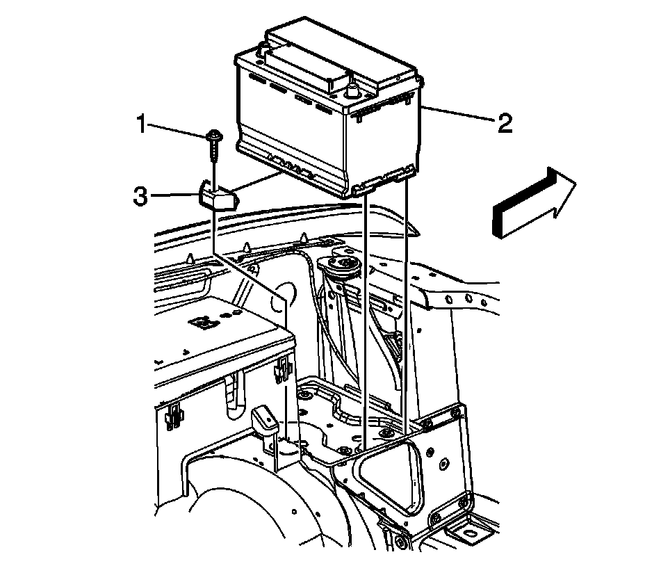 6. Remove the battery hold down bolt (1) and hold down (3).