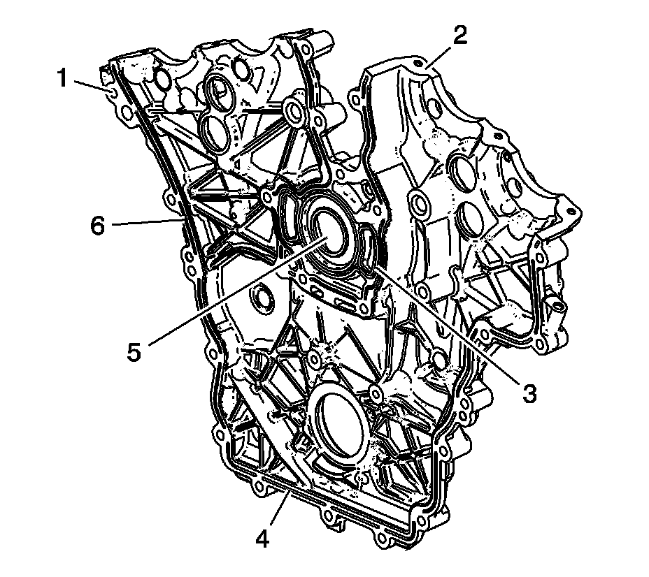 * Gouges or damage to the engine front cover sealing surfaces to the engine block (6), oil pan (4), and/or camshaft covers (2)