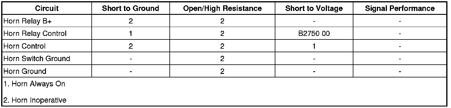 • If the test lamp is always OFF, test the control circuit for a short to voltage or an open/high resistance. If the circuit tests normal, inspect for an open horn switch.