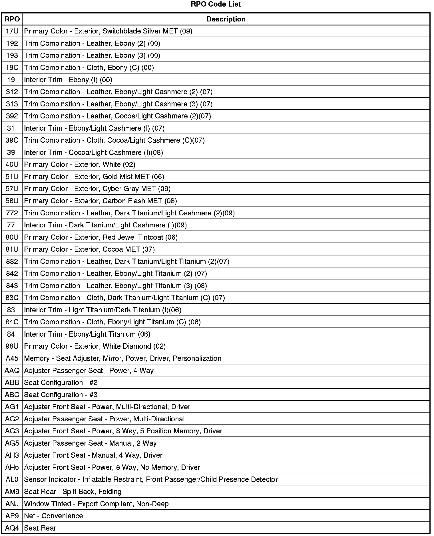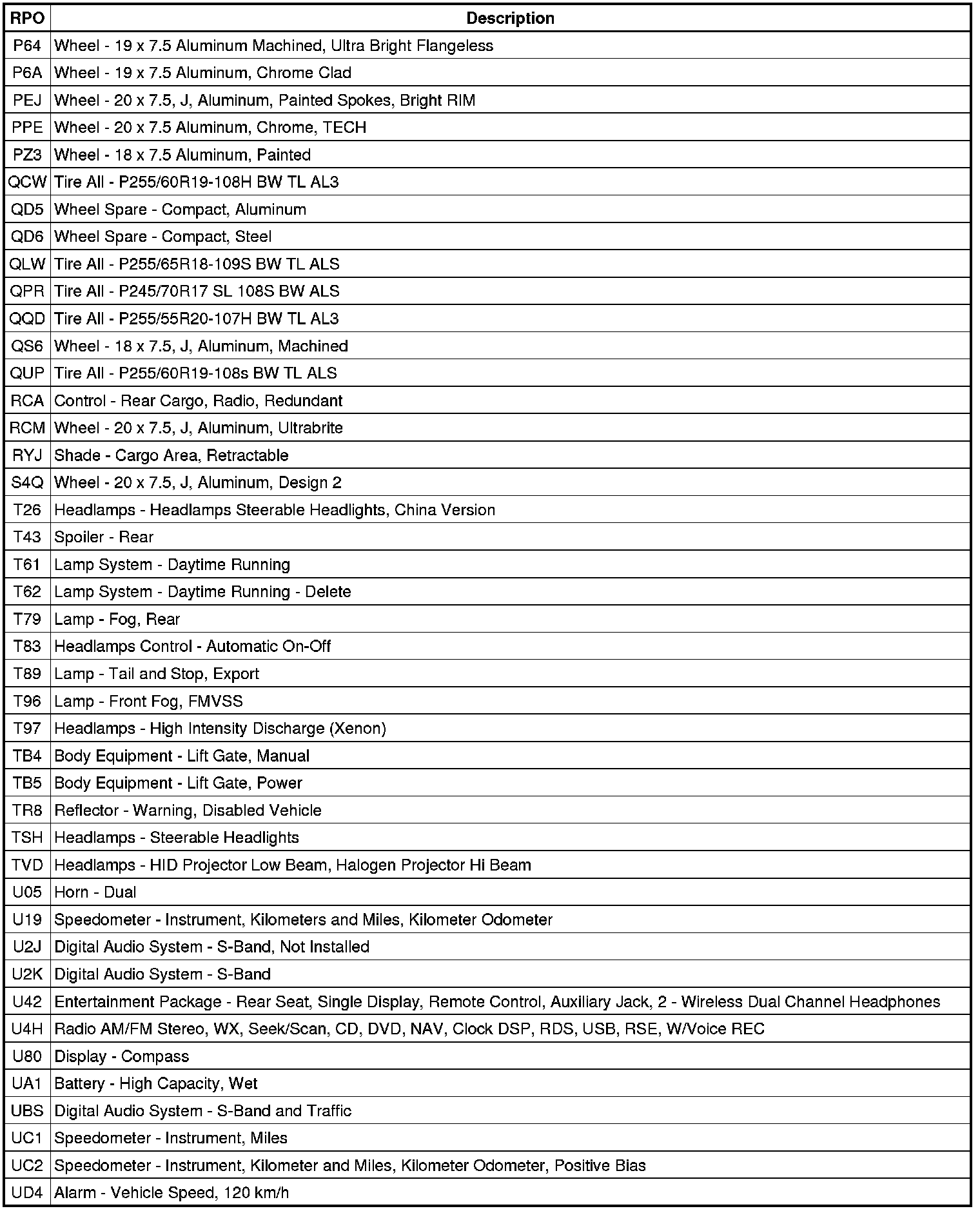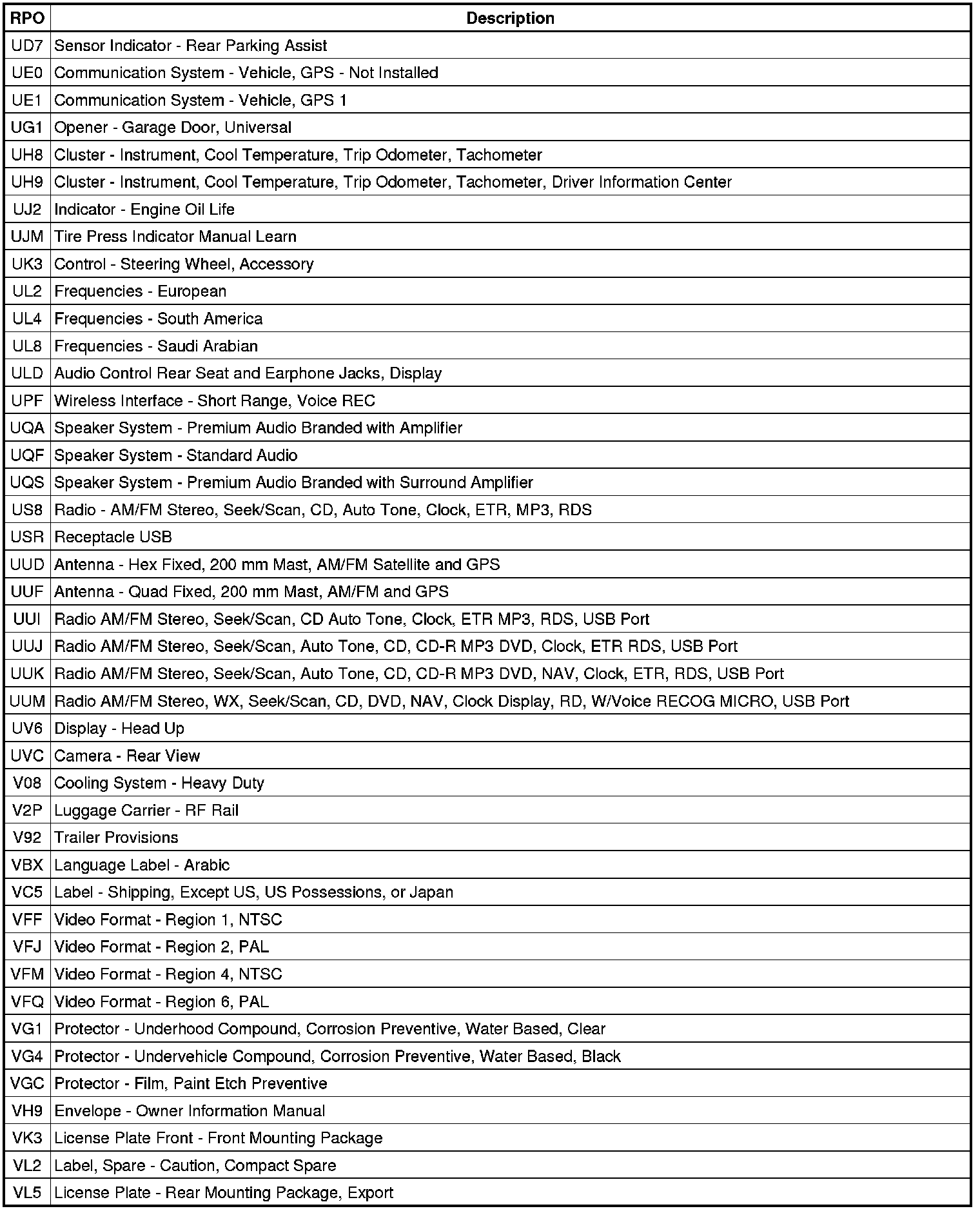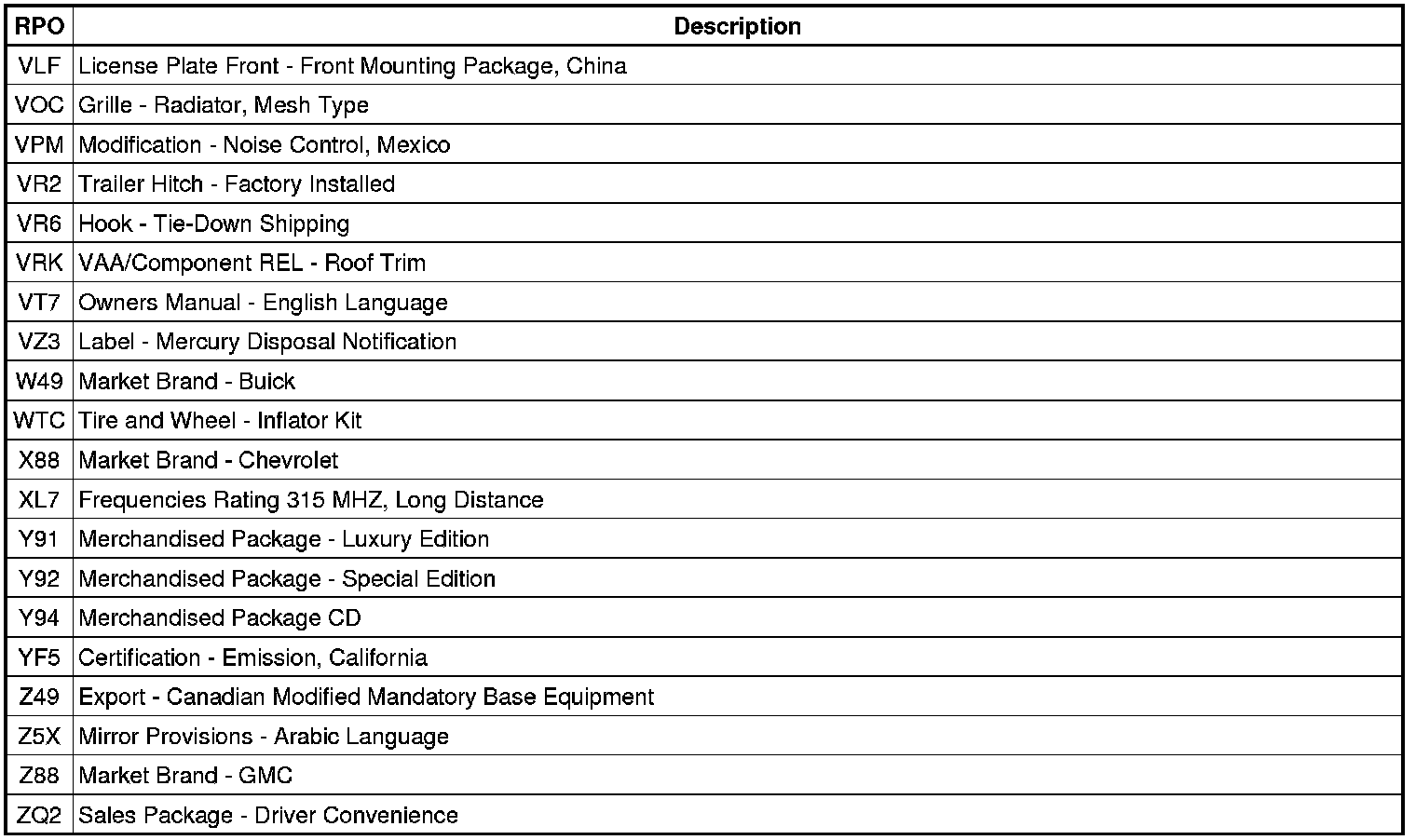The following table provides the description of the RPO codes that are available on the vehicle. The vehicles RPO list is printed on the Service Parts Identification Label.