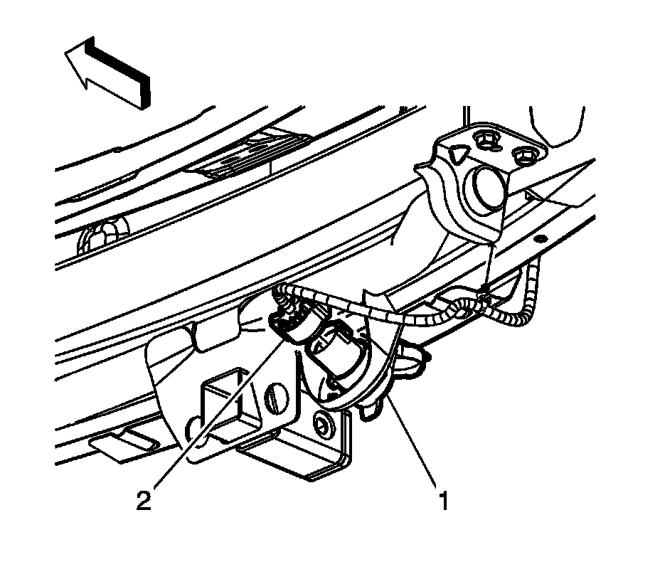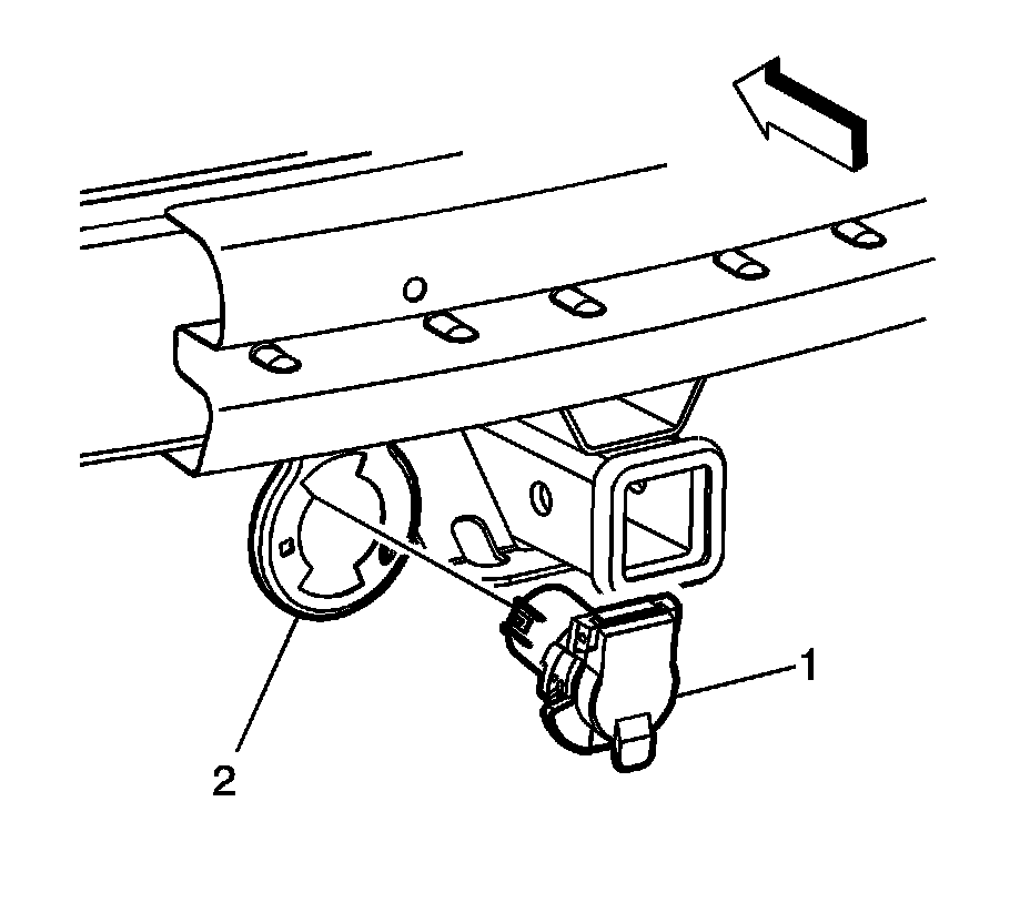 3.If replacing the trailer hitch, remove the trailer wire harness connector (1) from the trailer hitch (2).