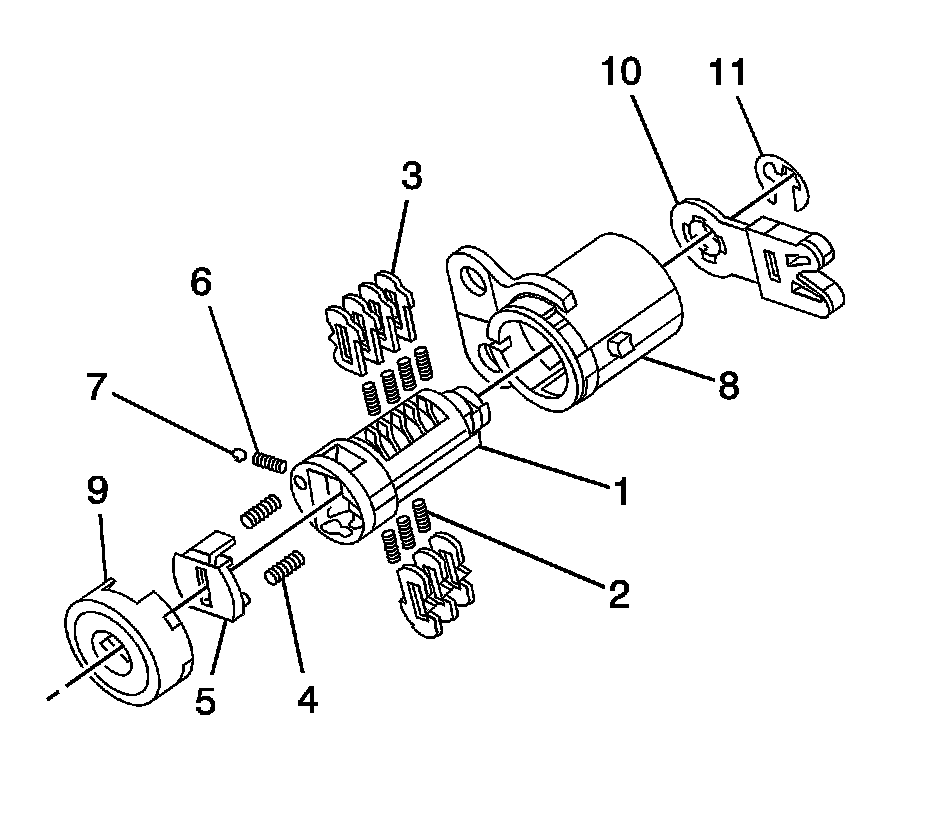The ignition lock cylinder uses only 7 of the 10 cut positions, 2 through 8. The ignition cylinder tumblers (3) are located on alternate sides of the cylinder (1). They are snap-in and self-retaining. It follows the key code with the first tumbler being the first depth of the key code, closest to the head of the key.