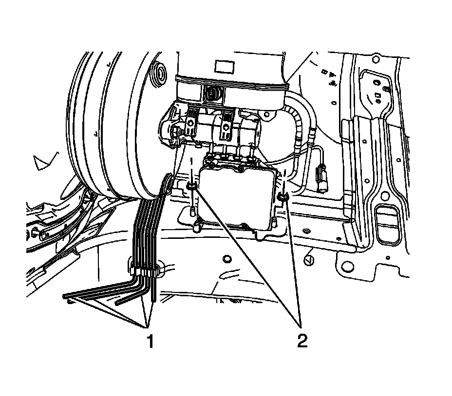 9. Remove the 2 nuts (2) from the brake pressure modulator valve (BPMV) assembly.
