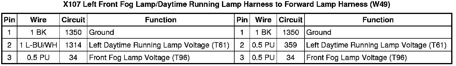 X107 Left Front Fog Lamp/Daytime Running Lamp Harness to Forward Lamp Harness (W49)