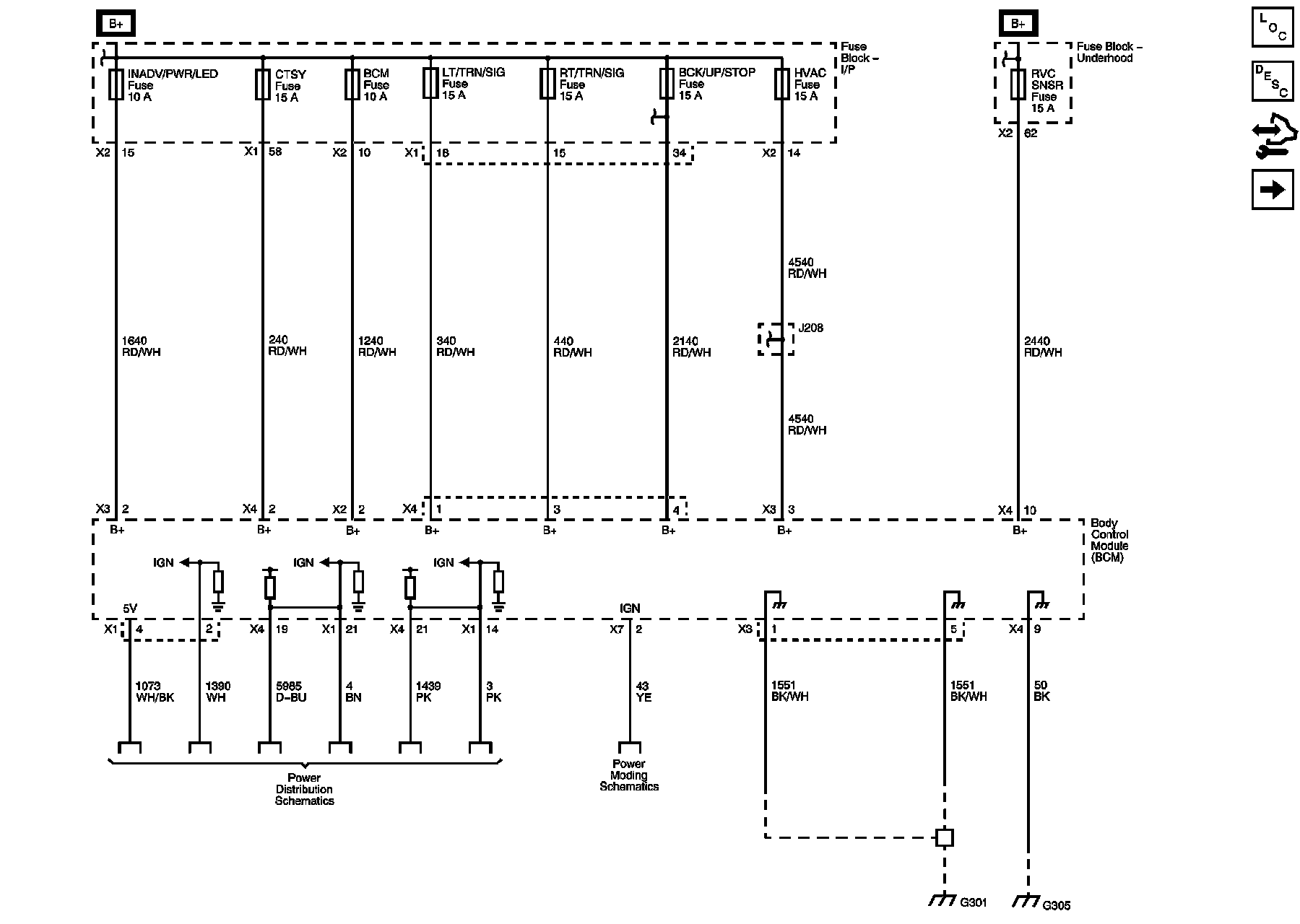 BATT 2, BCK/UP/STOP, LT/TRN/SIG, PDM, PWR/MIR, and RT/TRN/SIG Fuses, LT/PWR/SEAT, PWR/COLUMN, and RT/PWR/SEAT Circuit Breakers
