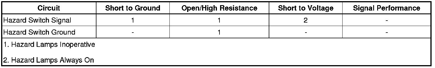The body control module (BCM) controls the hazard lamps based on inputs from the hazard switch. With the hazard switch closed, a ground path is provided on the hazard switch signal circuit, indicating a hazard lamp request. When this request is seen, the BCM will pulse the turn signal lamp control circuits, illuminating the turn signal lamps.