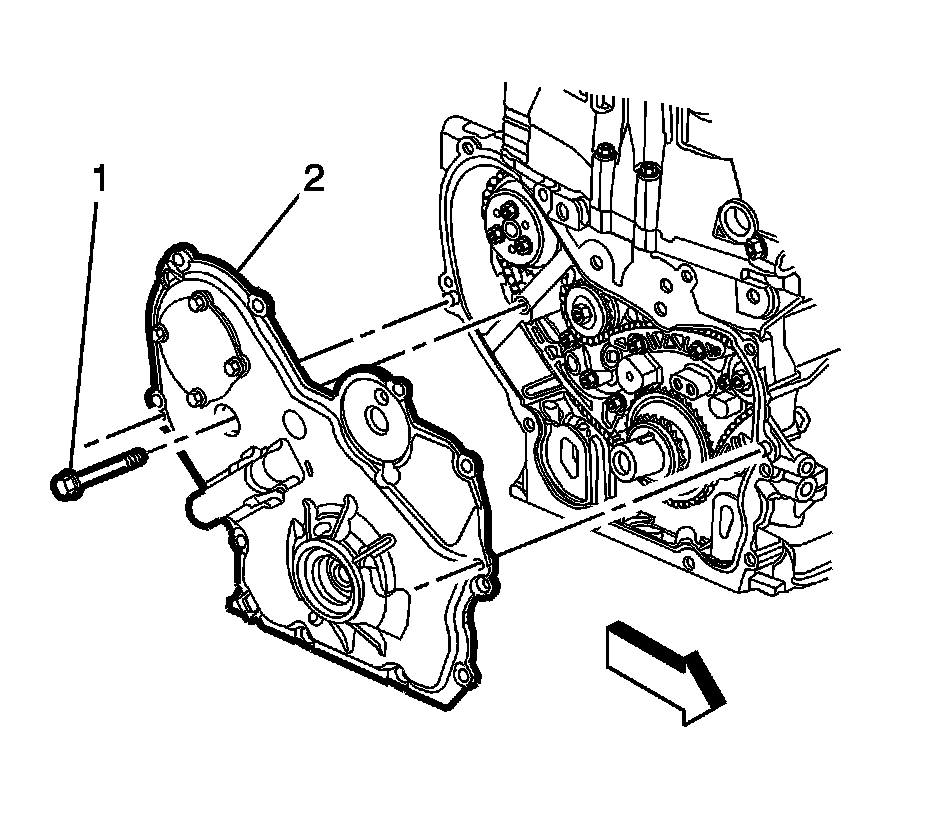 Install the engine front cover to water pump bolt (1) and tighten to 25 Nm (18 lb ft).